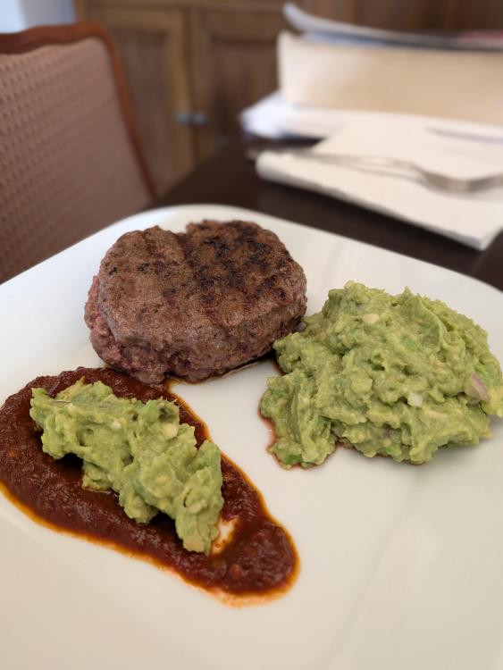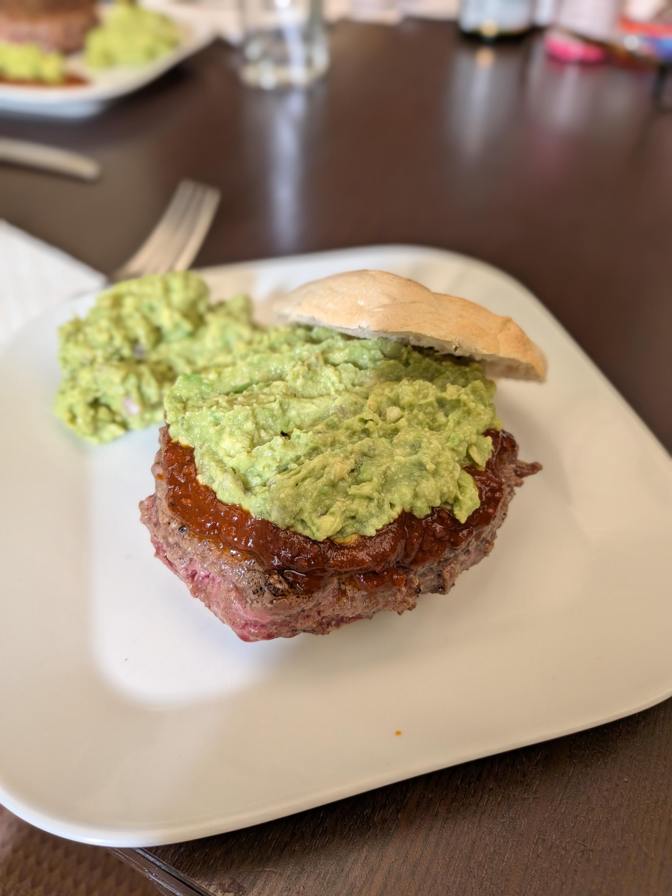 Practically the only other thing found in my local Wegmans supermarket, ground bison. We had received a couple avocados from our online supermarket for free last week. There were no rolls so I used a frozen English muffin. Also chipotle puree I keep in the freezer. My wife opted for the low carb version: