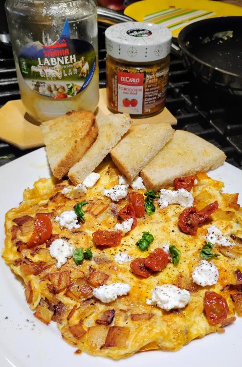 I usually start the day with a smoothie but decided to give the blender a day off. I had a few odds and ends in the refrigerator that became a tortilla de patatas-ish breakfast. The filling was leftover potato pave, red onion and yellow pepper sauteed in butter and tomato infused olive oil. I topped the two egg dish with labneh and semi-dried tomatoes.