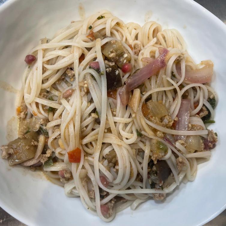 A variation on Murgh Keema - ground chicken is cooked with eggplants, onions, garlic, chilies, garam masala, tomatoes, parsley and cilantro. In parallel, you sauté some red onion slices, almonds and pomegranate seeds. Everything is mixed and served with rice noodles