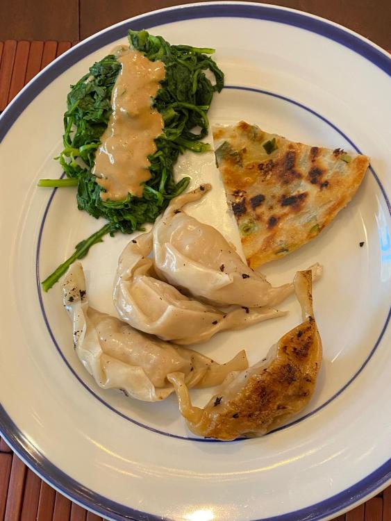 More time on my hands these days, so I made dumplings again. With a semi new vegetable for the boys- edible chrysanthemum with a sesame dressing. And a scallion pancake that was the last one in the pack, got to clean out the freezer