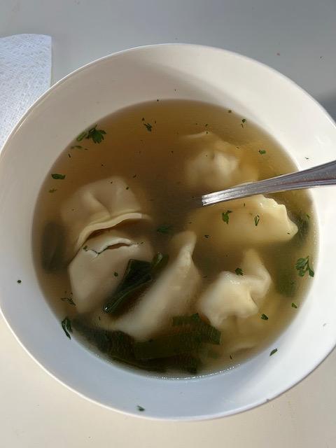 Another soup as we are having a run of cooler rainy weather. Bought pork dumplings with a quickly made broth with Asian flavours… meaning some coriander, fresh ginger, lemon grass paste, soy sauce and chicken stock all simmered for about only half an hour.
