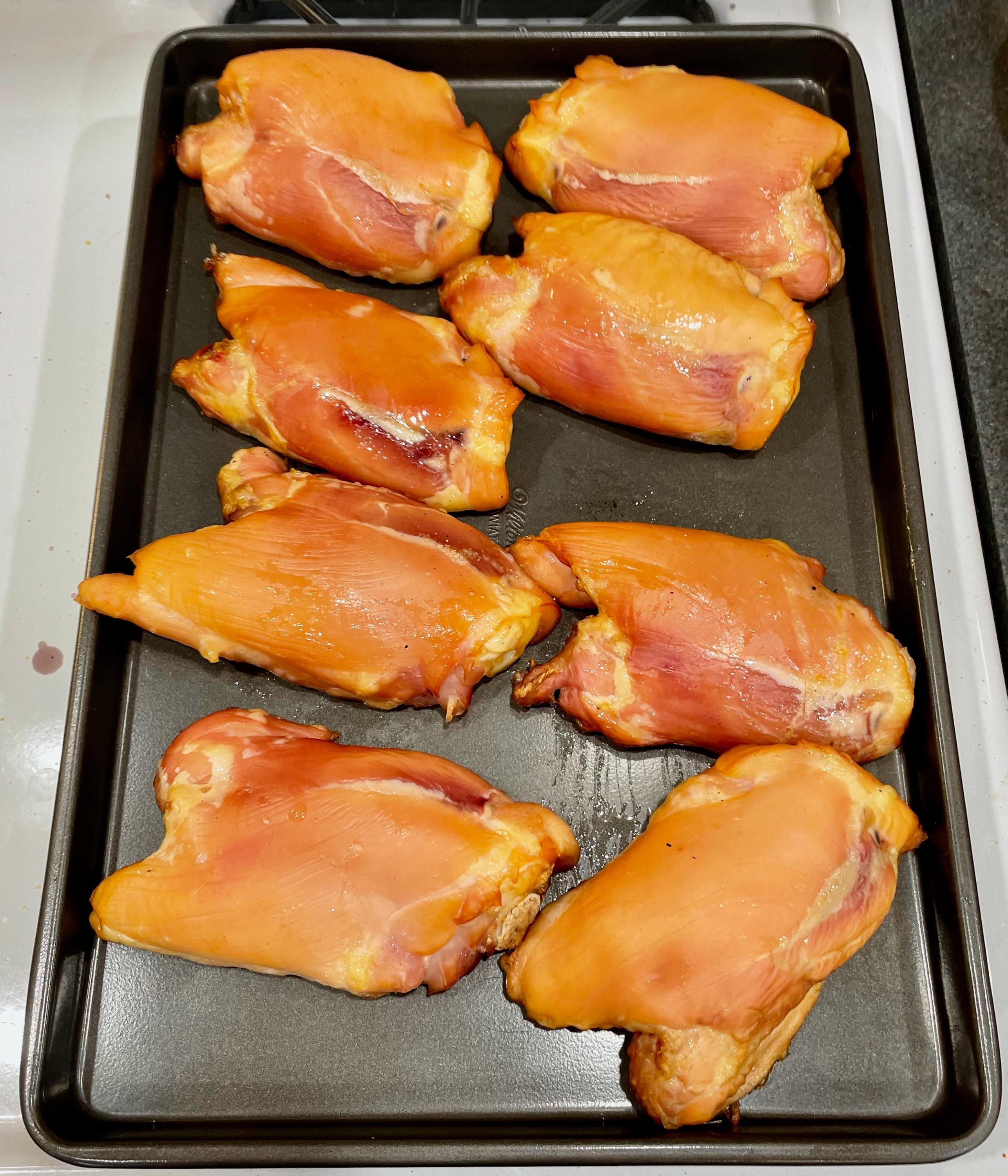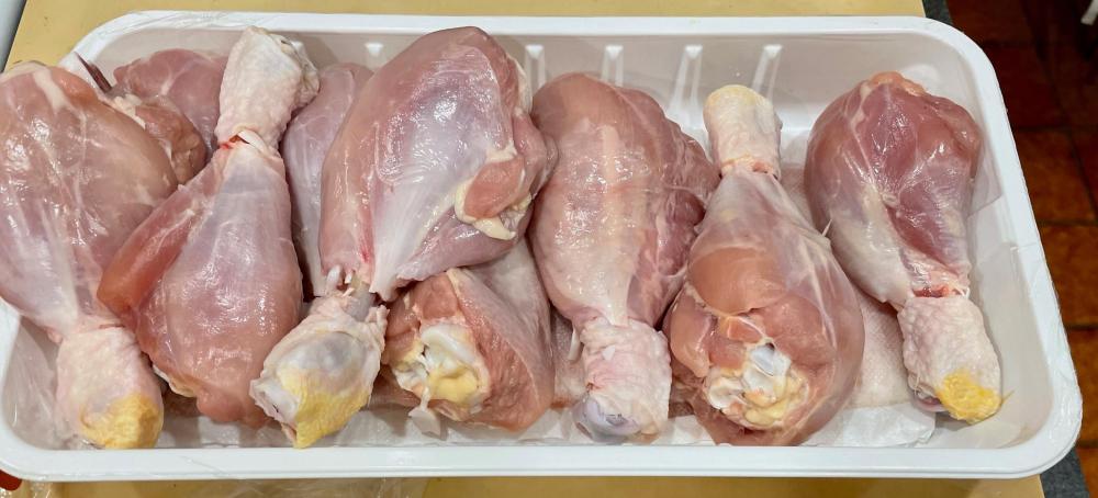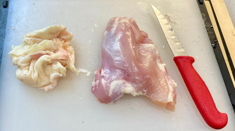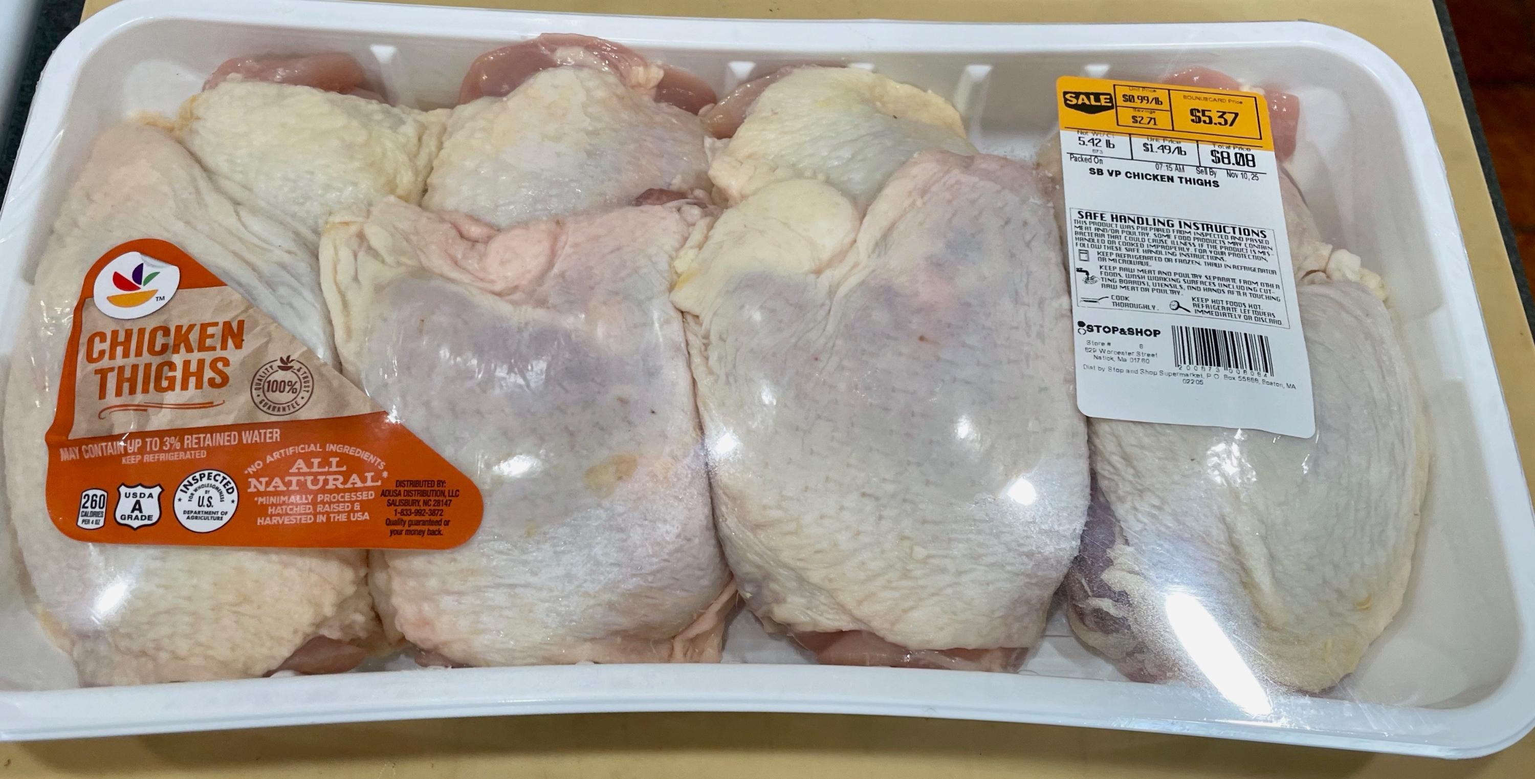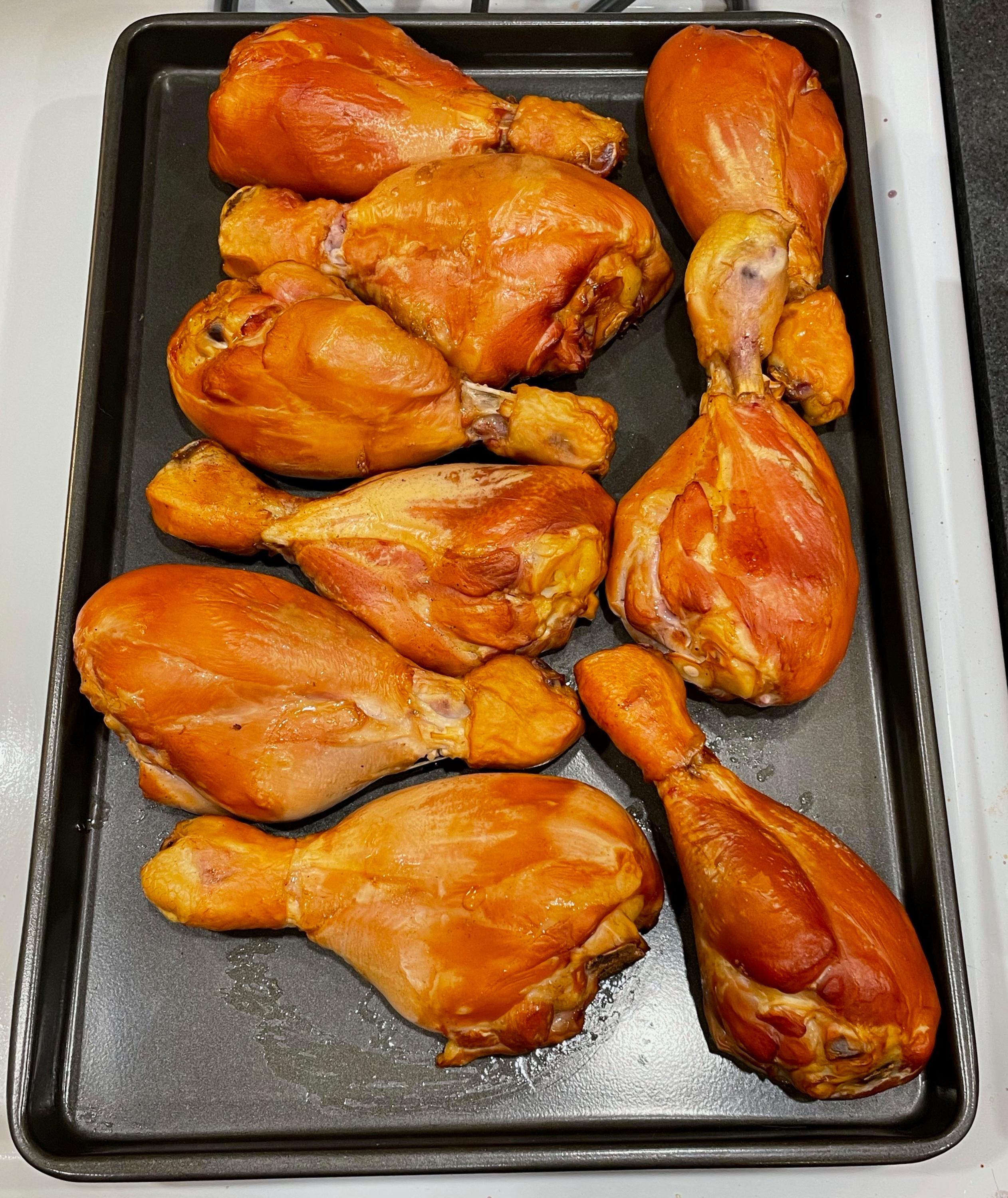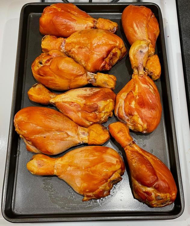I started w a tray of thighs . I wanted to see how easy they were to trim away the skin // excess fat , and if S&S gave you that extra flap under the thigh : they did ! trimmed . note : the every day price of the thighs is higher than the legs ! these went into the IDS @ 185 F , full smoke , for 3 hours , shifting trays ever hour : as it was still early in the day when the thighs started their smoking , went back to S%S and got a tray of CkDrums ; these were actually a bit easier to trim : I learned from the last tiem I used these , its impossible to get all the skin off, as the bit around the end of the bone is stuck there firmly . Soooo I cut around the skin , right to the bone , about 1 " up from the bottom of the bone. then bluntly dissected the skin away from the bone , which was fairly easy to do . I cut the freed up skin down to the end cut , and peeled the rest off the leg. It stuck fairly firmly in one area. I then bluntly dissected the skin all around the leg , down to the bottom 1 " before I cut the released skin to the bone end. Easier this way : these also went into the IDS for 3 hours , 185 F , hourly rotation . I measured the ' trim's ' weight , and as I thought : the trim on the thighs was 31 % of the chickens weight , and was 17 % of the legs weight. as I thought , they do slip you more skin // fat w the thighs . these leg are very very large , much more so that MarketBasket so if you use slimmer legs , you wont get as much meat // leg. I was initially planning to use the thighs for ' SV IDS thighs ' , as I recently just SV'd a pack of skinned legs , w/o IDS'ing , and was pleased w the results. but Im going to make IDS smoked CkStock w the thighs via the iPot. and SV the legs , as Ive done in the past. Ill saute the thighs first , to get some fond and Maillard flavor first. learned this : stick w the plump legs @ S&S . thighs are not worth it. And remember here the color on the legs // thighs is from the smoke , not the Maillard Rx.