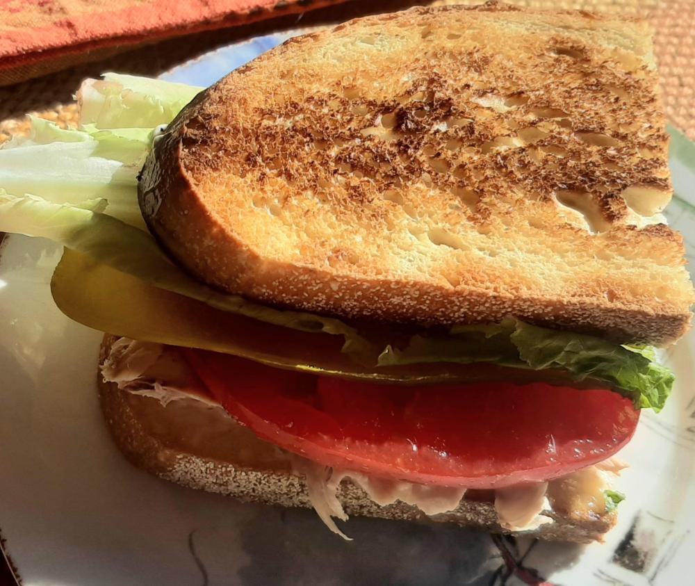 @Maison Rustique mentioned her fear that she sounded like a broken record in the Dinner topic. I'll second that, for myself, in the Lunch topic. But I'm going to go right ahead and celebrate this seasonal joy anyway. Rotisserie chicken, a delectable slice doled out from my final-of-the-season farmers' market tomato, pickle, lettuce, all on toasted sourdough bread. All that stack made it a bit of a Dagwood sandwich, and I had to eat it carefully as it dripped over my plate, but oh what a treat! I'll be sorry when that tomato is gone.