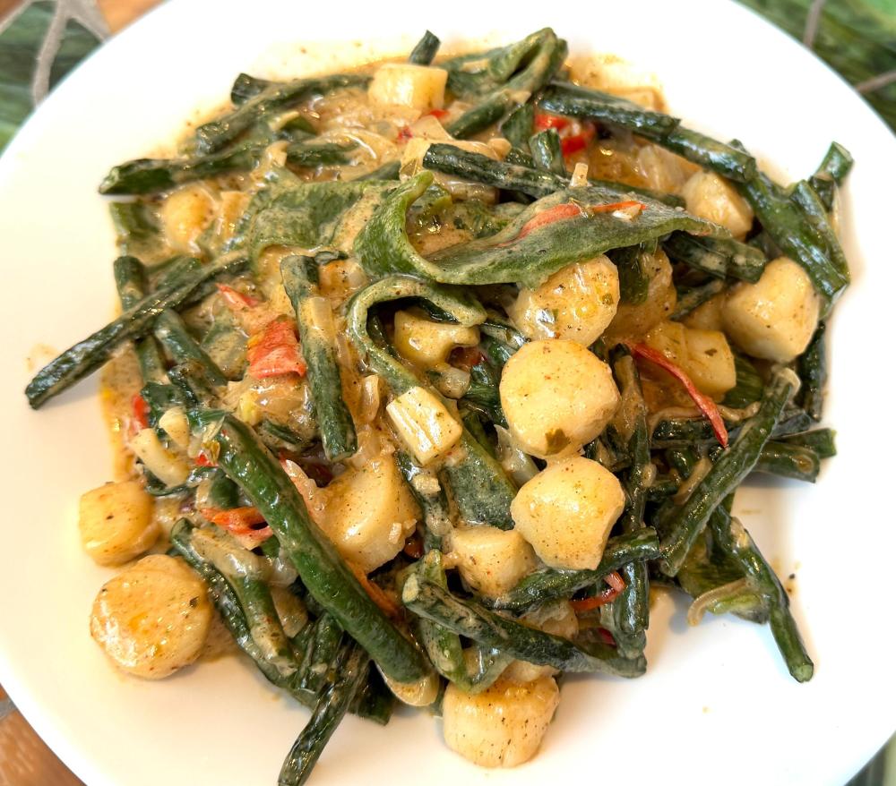 Bay scallops, roasted chile Poblano rajas, and long beans with shallot, garlic, sliced Holland chiles, and coconut milk. Seasonings included cilantro, cayenne, and garam masala.