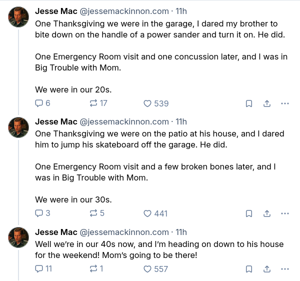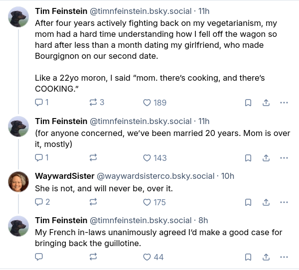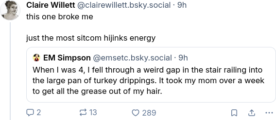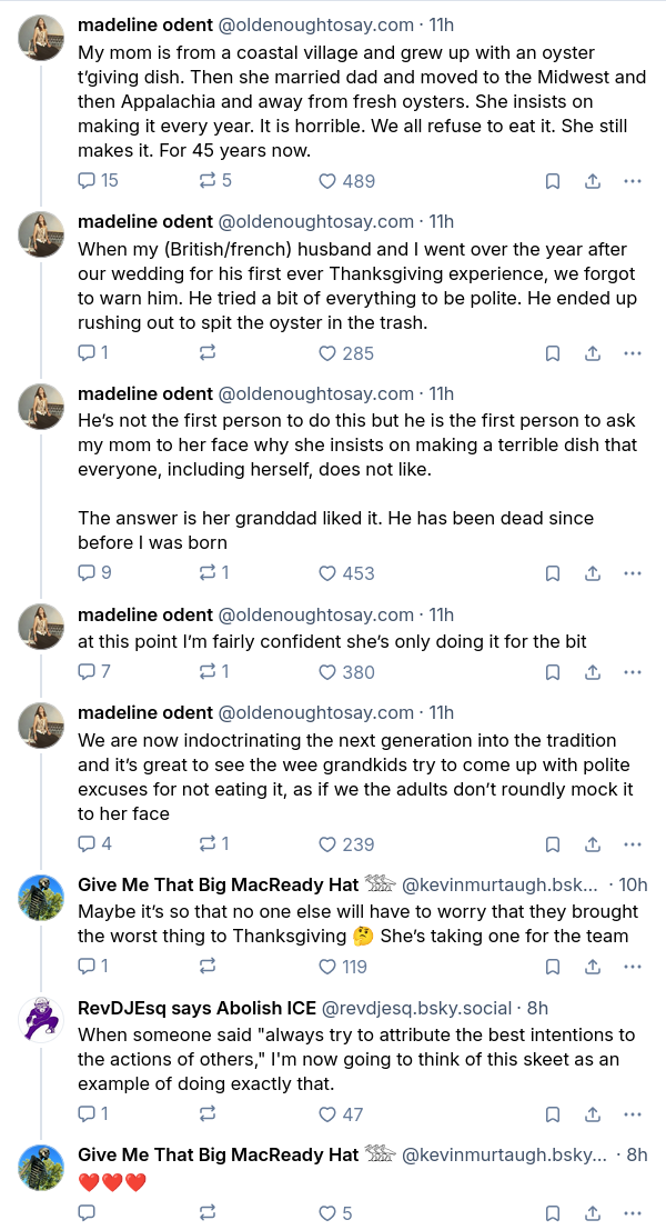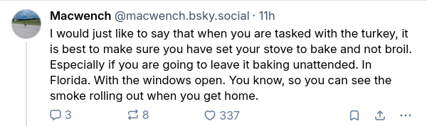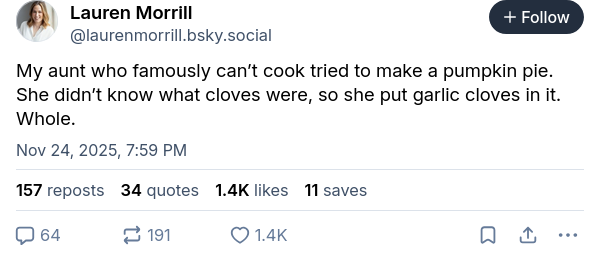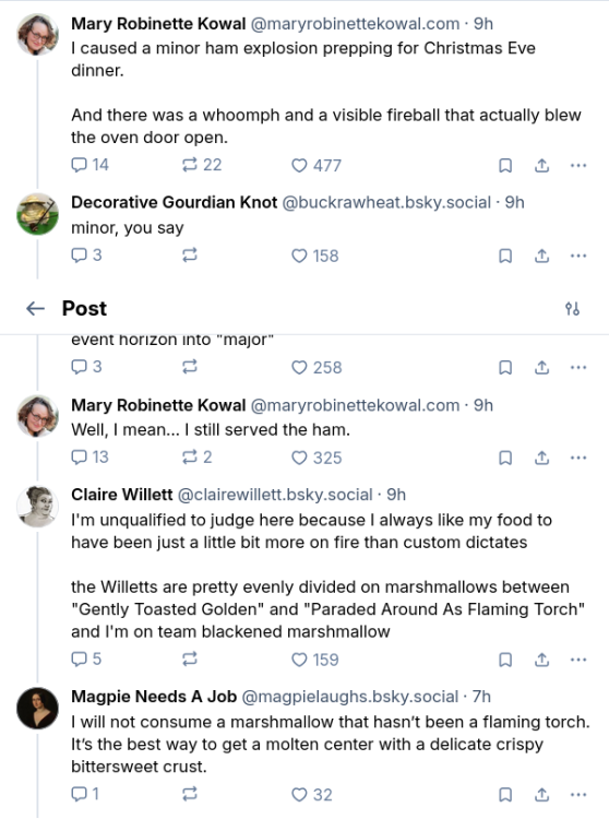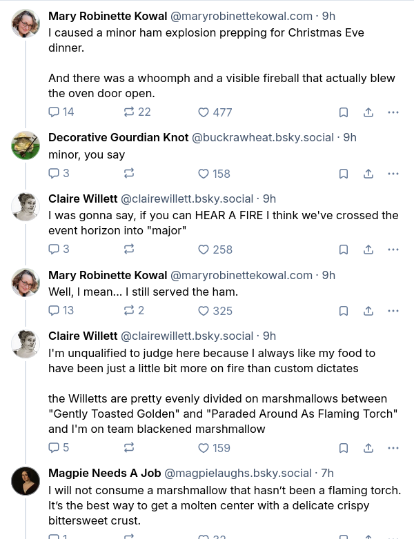 I don't know how many here (if any) are on Bluesky, but author Claire Willett solicited readers' best/funniest stories of Thanksgiving meals gone wrong. The whole thing is worth a read, if you're on the platform (here's the link: https://bsky.app/profile/clairewillett.bsky.social/post/3m6fypqlkes2p), but I've picked a couple of fun examples to give you all the idea. Some are just basic mistakes: Others have that "family stories that live forever" energy: ...and some are especially inspired examples of Cookery Gone Wrong (MRK, for those who don't know, is a popular/successful science fiction writer). And finally, a moment that somehow turns The Dish We All Dread into something surprising and uplifting: