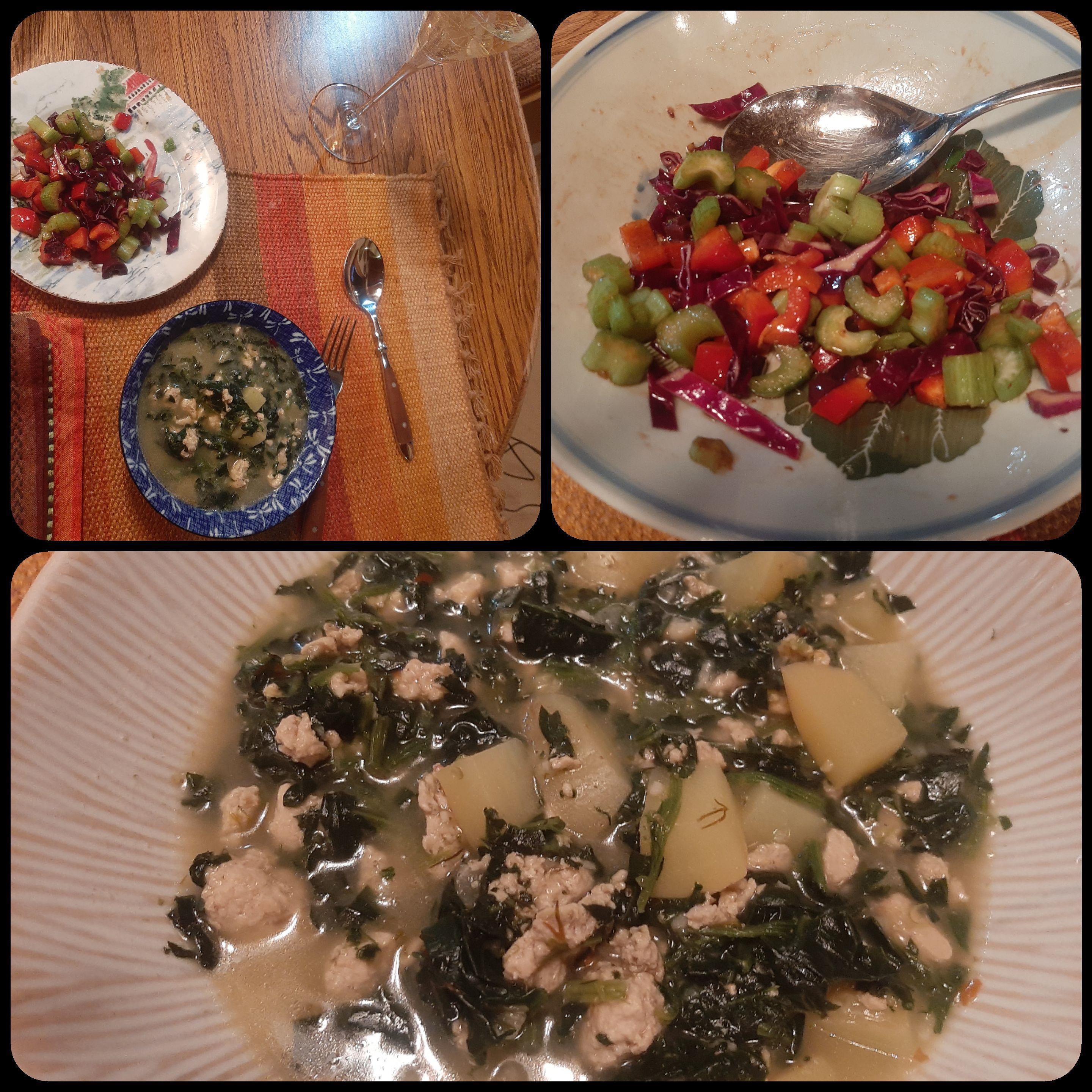 My best friend is visiting from San Diego, and we have a series of delicious recipes queued up for dinners while she's here. Last night it was a New York Times recipe for Lemony Greek Chicken, Spinach and Potato Stew (gift article in the link). Delicious, and easy. Ground chicken, onions, garlic, lemon juice, chicken broth, frozen spinach, and seasonings (oregano, dill, rosemary, salt, red pepperf). Topped with crumbles of feta cheese. To go with it, we chopped celery, red bell pepper, red cabbage, and kalamata olives, and tossed them with her preferred vinaigrette: red wine vinegar, red balsamic vinegar, olive oil, mustard, garlic. It was all easy and delicious, and we had plenty of leftovers. She's having some for lunch as I write this, and notes that the stew has thickened noticeably. Sorry the pictures didn't come out well, but the dinner is worth commemorating anyway.
