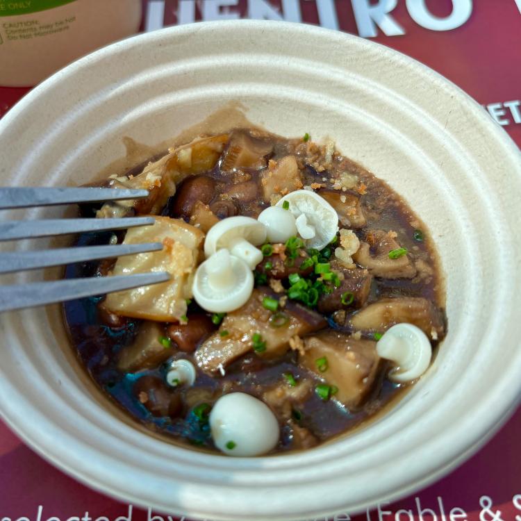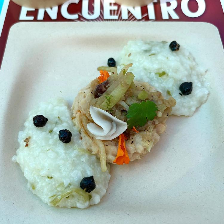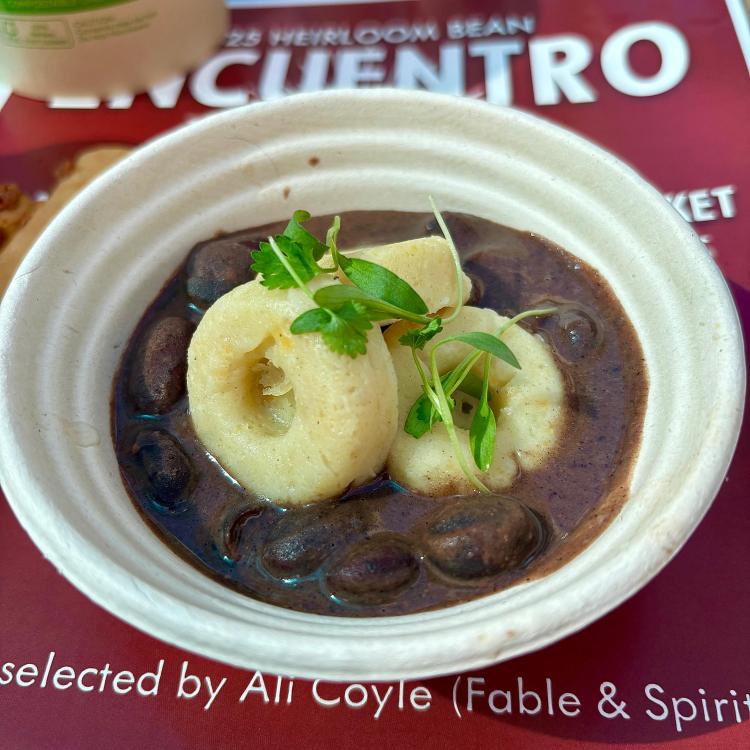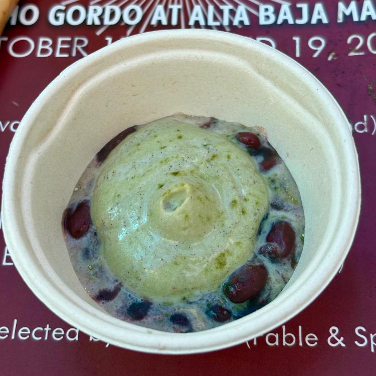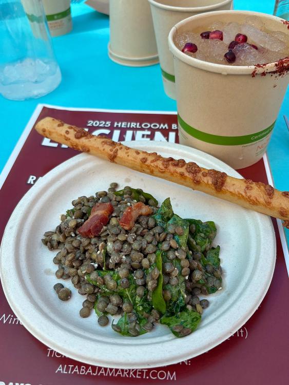 Today’s lunch hasn’t started yet but I thought I’d tease you with the menu I’ll be back with the deets later. OK, I survived the LA traffic and made it home after a delightful meal at the 2025 Heirloom Bean Encuentro at Alta Baja Market in Santa Ana so I can report on our meal. The location is a specialty grocery market specializing in foods of Mexico and the southwest US. They also have a cafe and have been hosting this annual bean gathering for several years now. Their cafe is tiny so putting on this event is quite an undertaking. I did not partake of the wine pairing since I was driving but I bought a bottle of each of the wines to take home. They’re all from wineries in Baja California. At the moment, I’m sipping a glass of the rosé, a Grenache-Syrah blend that was served with the lentil salad. Very nice. We started off with a refreshing agua fresca dubbed Agua de SanTana. The glasses (paper cups 🙃) were rimmed with Rancho Gordo Stardust chile/lime powder and garnished with pomegranate arils. The first food course was a Puy lentil salad from chef Evan Kleiman, former restaurateur and current host of the Good Food podcast. In this photo, the lentils are in front with a crunchy breadstick and the paper cup of agua fresca is behind the plate. The next dish consisted of two scoops of warm rice porridge with pickled kohlrabi and smoked black garbanzo beans flanking a cool disk of alubia blanca mash with miso topped with apples and pickled Christmas lima beans, nasturtium flowers and herbs. My photo doesn’t do this justice, nor does the paper plate, but it was a delight to eat and the story behind it was even better. Chef Minh Phan works with culinary arts programs at local public high schools and this dish was her idea but was entirely prepared and plated by a group of her students. They all came out to join her on the stage so we could give them a big round of applause. Next up were buckeye beans and forest mushrooms from Chef Tony Ensault. The mushroom broth was deeply flavorful but also clear and not murky at all. The tiny (see my fork for scale) white beech mushrooms on top were pickled to add a bright note. Next up was a dish of Ayocote Negro beans cooked with habenero chiles and xoconostle for a fun mix of heat and tartness. The beans were topped with dumplings made from masa, potato and garlic. This was the only dish that some people found too spicy but I thought it was perfect. It was from chef Ray Garcia. The last dish, from Chef Eric Linares, was a macha custard with sweet Domingo Rojo beans. I wasn’t expecting a bean dessert! The bean component reminded me of Asian desserts with adzuki beans, except more flavorful. There was sweetness from the condensed milk but the beans themselves also had a savory note and the macha custard was rich and delicious. Again, the small paper bowls don’t show this one off, but it was delicious. In addition to the wine, I picked up a few other things in the market but I’ll post them elsewhere.