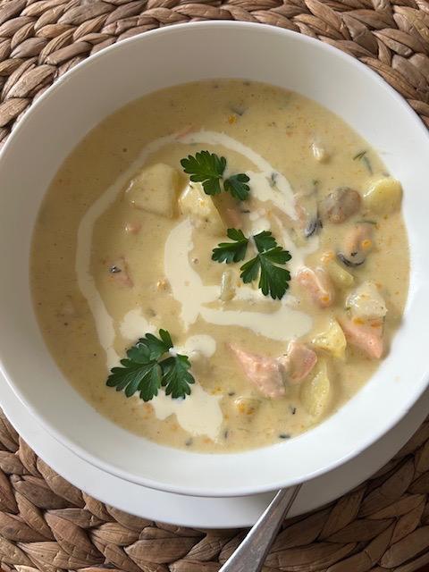 Lunch was Irish seafood chowder. Cooked a soffitto (Sp.various) in butter, added plain flour, added fish stock, added small cubes of potato. Simmered this for about half an hour then added some cream, milk, salt and pepper, some thyme, brought this all to the boil and added cubes of salmon, cubes of snapper, some shrimp/ prawns and a few shelled mussels. Cooked for 5 minutes till all seafood cooked. Done.
