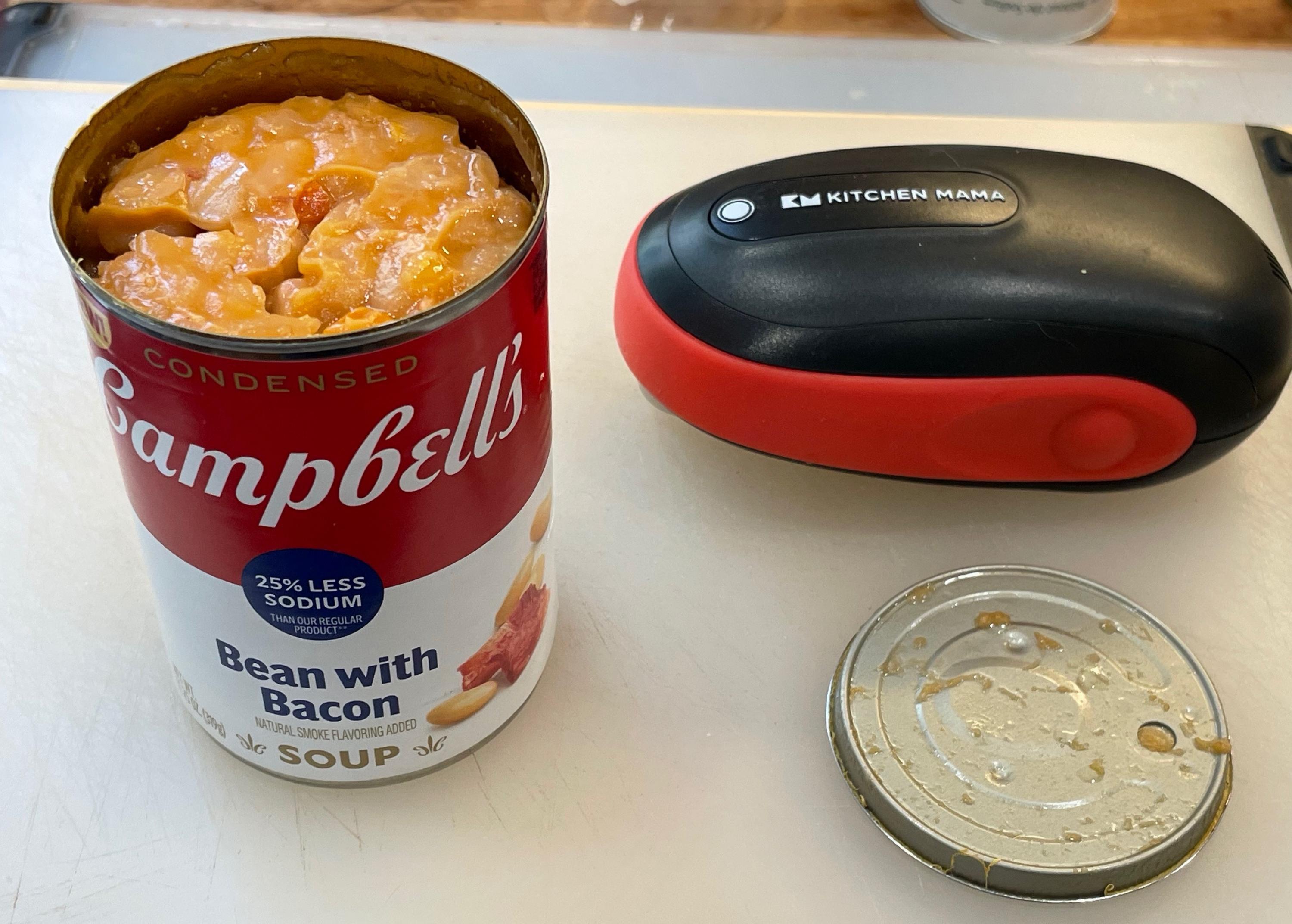 I finally got around to trying the Kitchen Mamma on smaller cans now that I have a very healthy ( lower salt ) supply of them : works quite well . this is very worthwhile as getting the ' firmer ' contents out of this type of can , w the rim that's left if using the pop tab , is a PITA contents that readily pour out of a can , are fine w the pop tab . K.M. just tripled in value for me !