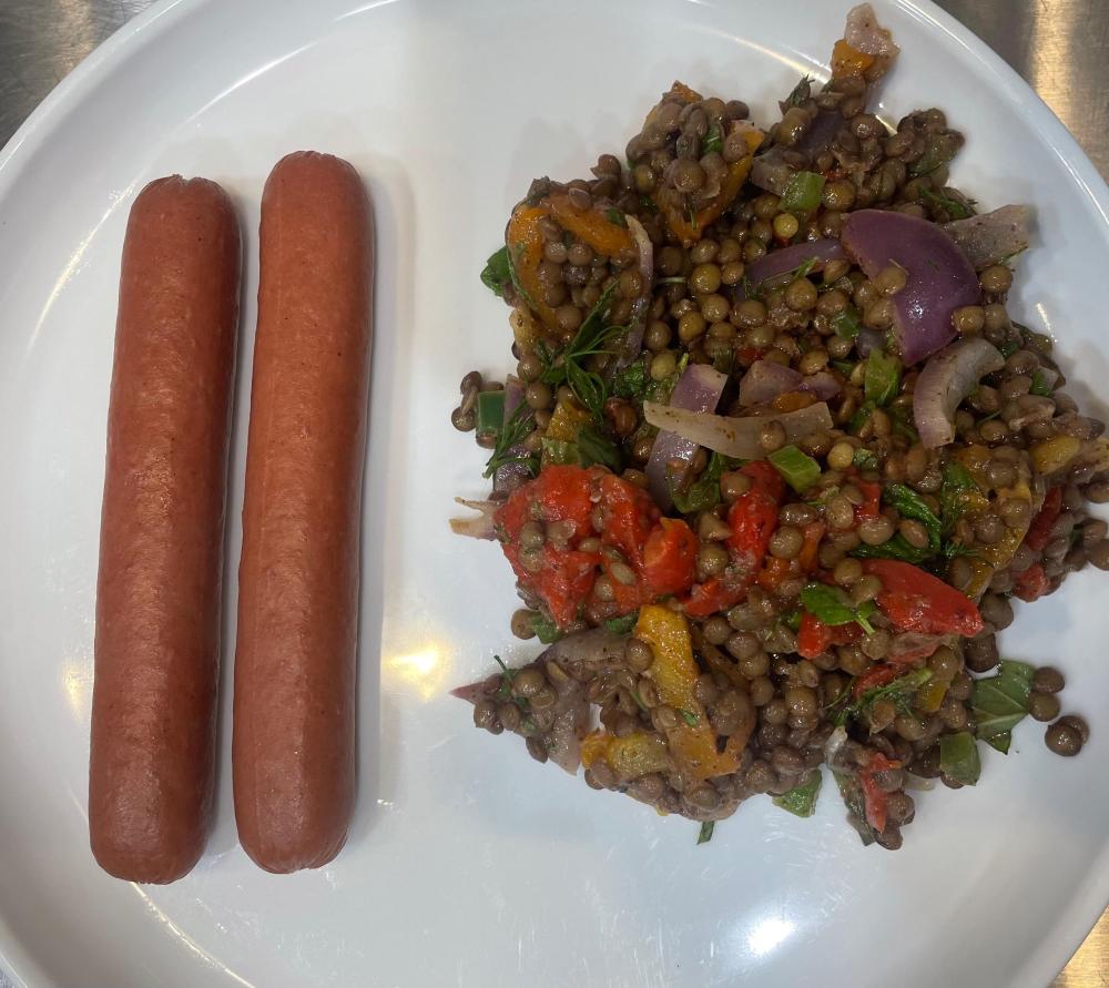 Turkish Lentil Salad with Sweet Peppers and Herbs from a Milk Street recipe - du puy lentils are cooked and mixed while still hot with a mixture of olive oil, pomegranate molasses, lemon juice, Aleppo peppers, sumac and cumin. Once it cools down to rt, the lentils are mixed with red onions, jalapeno, roasted red peppers and plenty of mint and dill. Served with some wiener wuerstchen