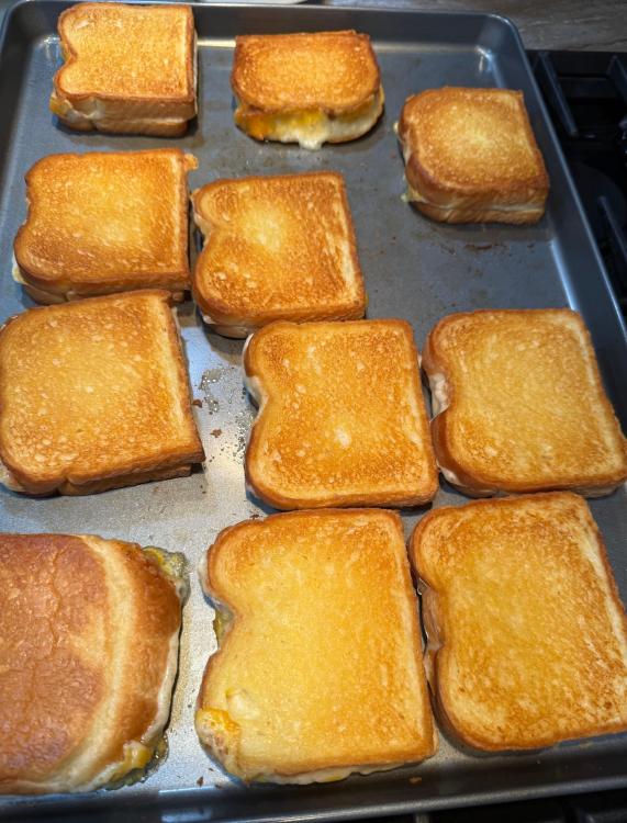 I did a test oven grilled cheese sandwich for Mike (my husband), who doesn’t usually care for grilled cheese (IKR?), and he thought it was really good. I’d weighted down a cookie sheet and put it on top, and boy, it was a smashed grilled cheese. Decided no weight was necessary and “tested” a batch and then ended up making 22 of them and taking them to the fridge. They were kind of greasy (sorry, recipients). I’d either use less butter next time or switch to mayo. Not a great pic, but the first full batch: The cheeses were a medium cheddar and havarti. I may or may not make more this week. Might make them another time and pair with homemade tomato soup (which I’ve never made before). Anyone have an opinion on a hard fried egg and cheese sandwich? Breakfast sandwiches are another option, especially if my granddaughter participates as planned. I’ll cook the sausage patties ahead of time, and bake the sheet pan scrambled eggs ahead of time, too. She can help me with cutting the eggs into rounds to fit on the sandwiches, and assembling. Frozen Grands biscuits will be used (sorry to all the people who are cringing over using frozen ready made biscuits). 🤷♀️ I might have unintentionally worried my granddaughter when I told her we would be making the sandwiches for children who don’t have enough food. She looked worried and later asked if her little brother could come, too. Maybe she thinks I meant the hungry children would be at my house? Will have to confer with her mother about it.