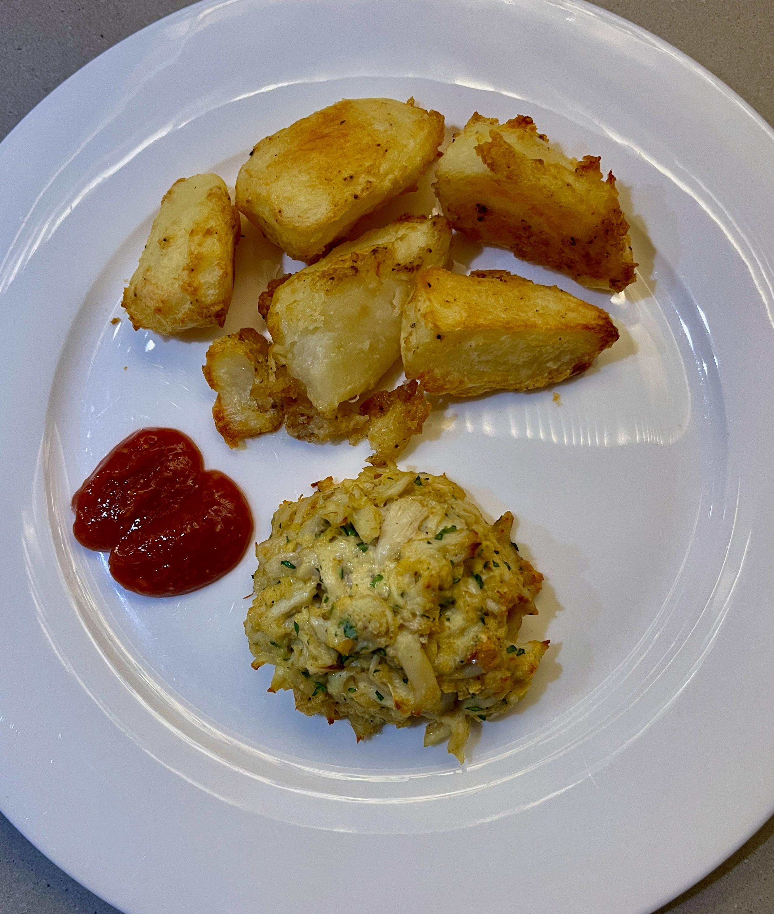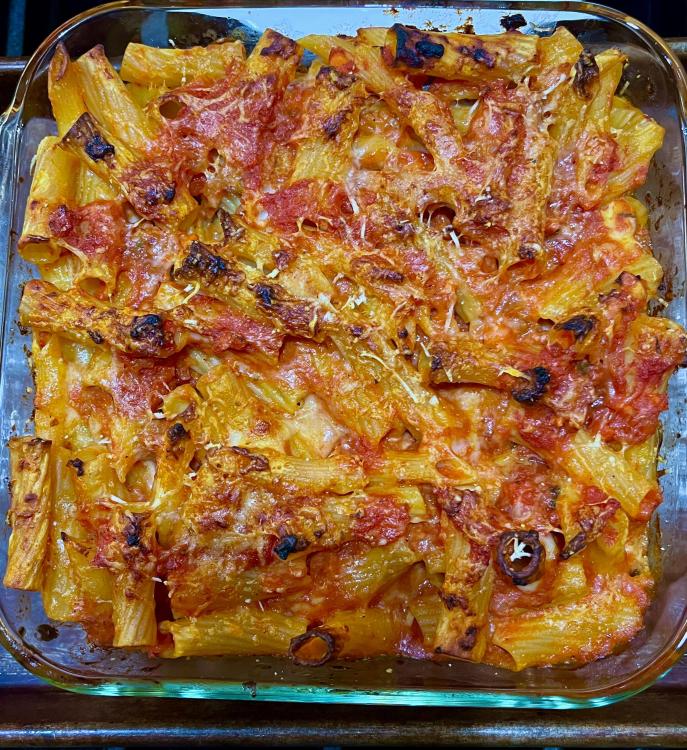 Last three dinners: Pan-roasted pork chop with pan sauce of mushrooms, shallots, white wine, chicken stock. Brussels sprouts. Maryland-style crab cake. Kenji's oven-roasted potatoes. House cocktail sauce. Baked rigationi w/four cheeses (Mozzarella, Muenster, Parmesan, Pecorino) and tomato sauce with sausage. Big salad.