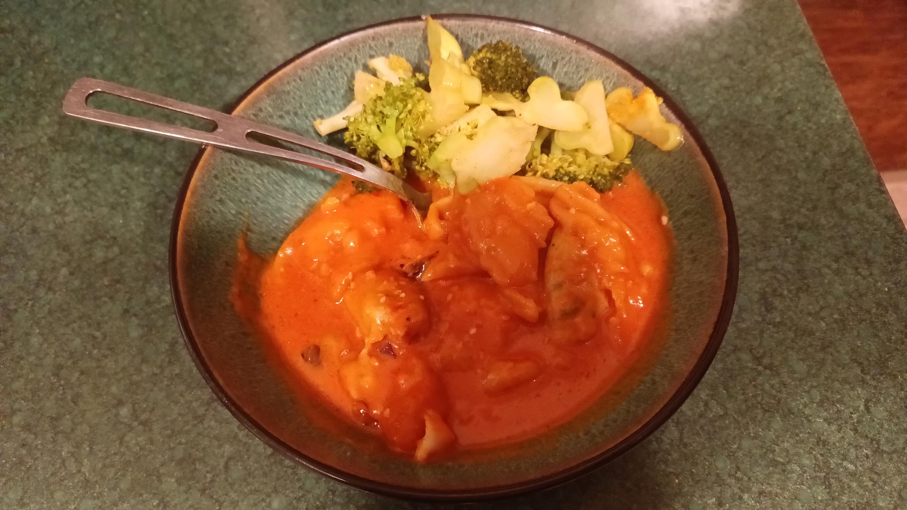 Red curry dumpling bake, side of steamed broccoli with nutritional yeast, smoked paprika, and umeboshi vinegar.