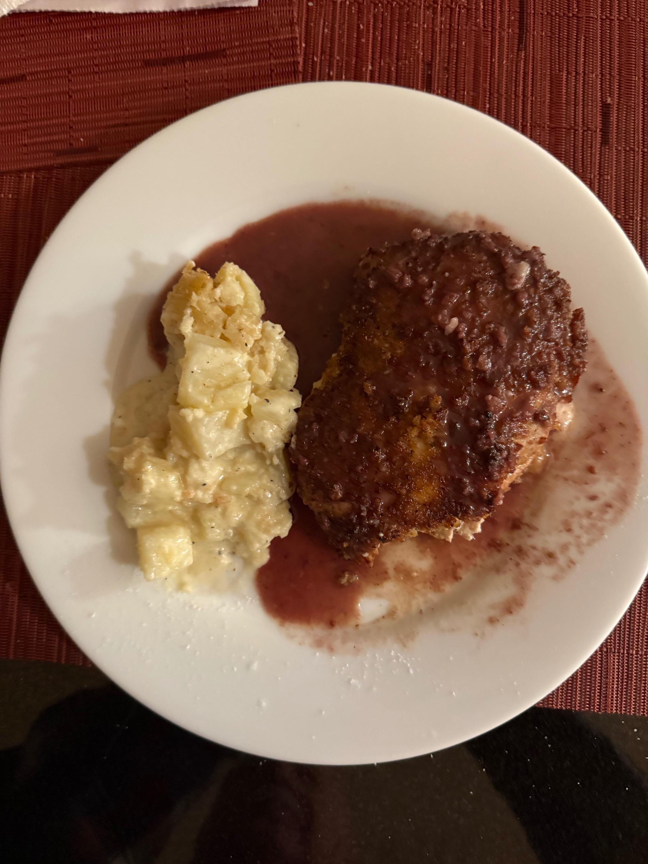 Dinner tonight. I took a bite before remembering to took a photo. chicken breast stuffed with fontina and prosciutto served with leftover Lighthouse Inn potatoes. I made a Pinot noir reduction while the chicken was in the oven.