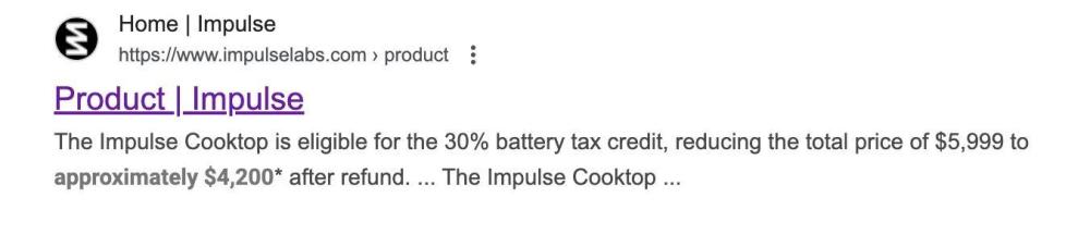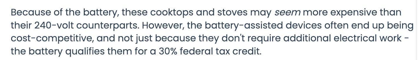 Cooktop : 30 " $ 6,999 on web site , but '''' The Impulse Cooktop is eligible for the 30% battery tax credit, reducing the total price of $5,999 to approximately $4,200* after refund '' https://www.quitcarbon.com/help/is-a-120-volt-battery-enabled-induction-stove-a-good-fit-for-my-home no idea is that credit exists for 2026 , or if it is '' at risk ' -