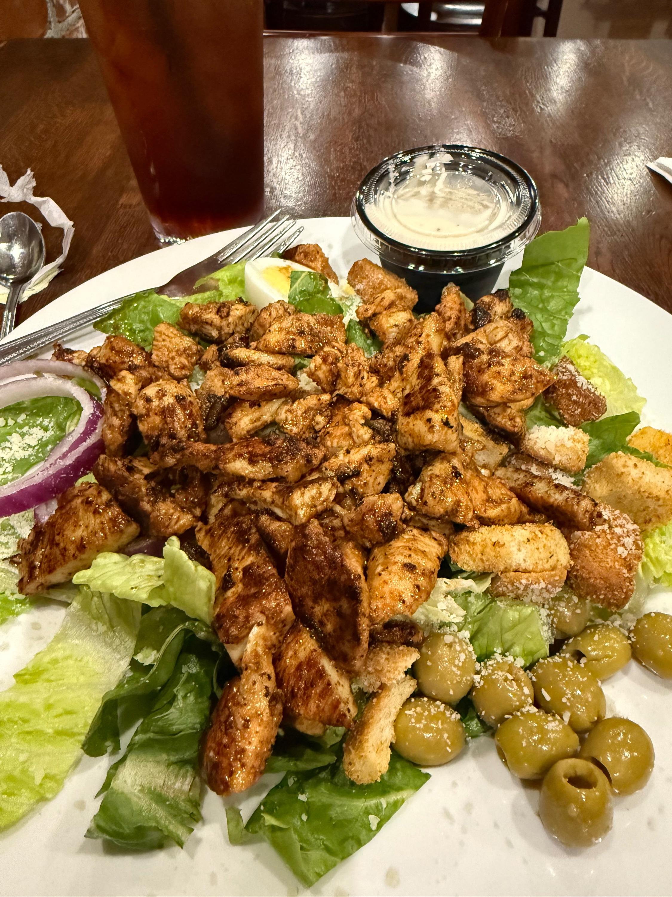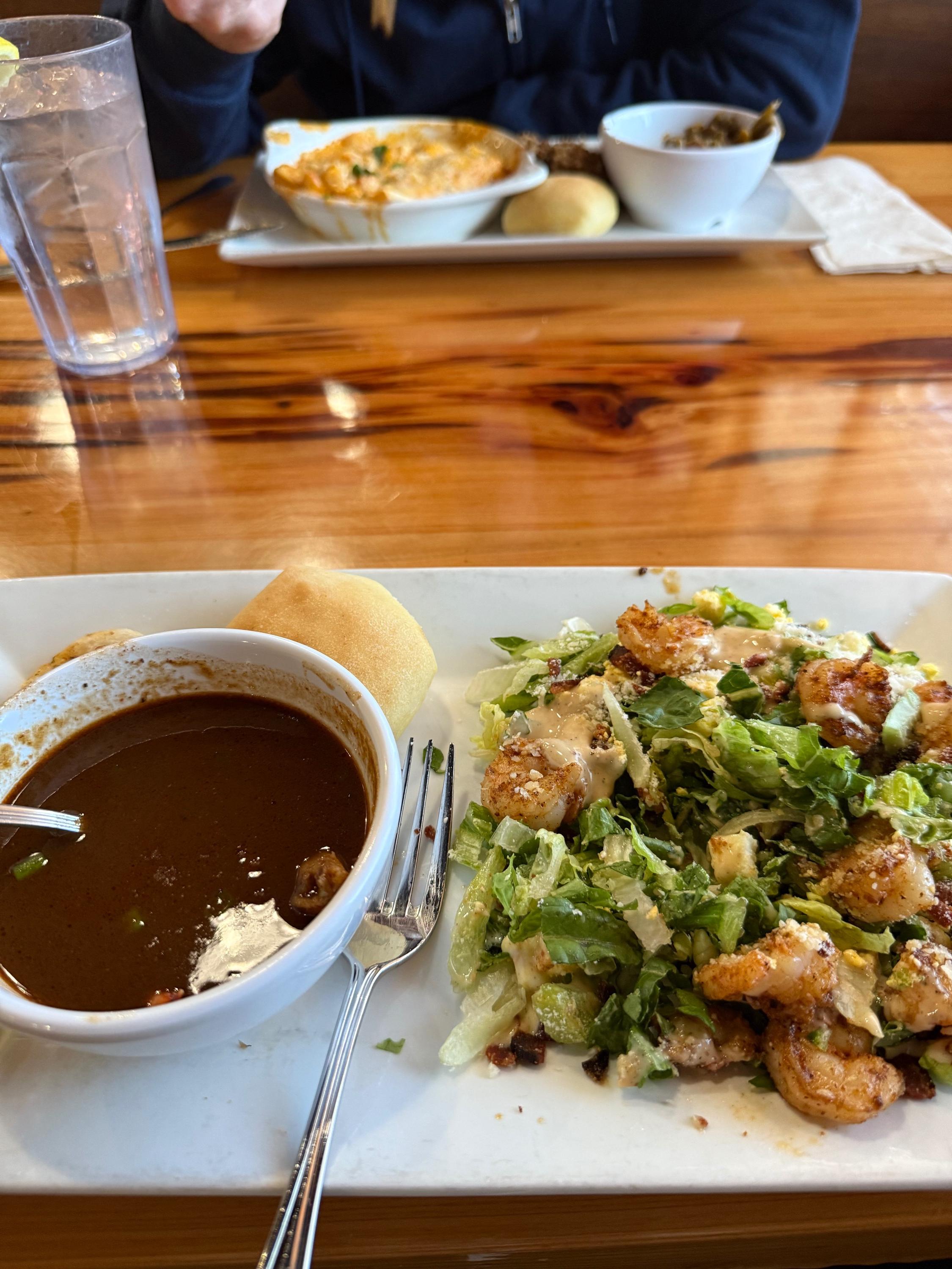 Out to lunch a couple of days ago with my husband. A cup of seafood gumbo (with hardly any seafood), and a shrimp Caesar salad for me. What I enjoyed about the salad was how easy it was to eat. The romaine was chopped into bite sized pieces and I didn’t have to fight to make it ready to eat. Oh, and it tasted really good. He had crawfish enchiladas that came with sides of rice dressing and green beans. He ate every bite, although neither of us tried the bread. At an all day meeting a few days ago I chose to eat at the restaurant where the meeting was held. The other attendants went elsewhere for lunch, which was probably smart. This grilled chicken Caesar salad was bountiful, but also, overpriced (in my opinion). After tax and gratuity, it was $35 and some change for a salad and a glass of iced tea. I was not ashamed to take the leftovers to go.