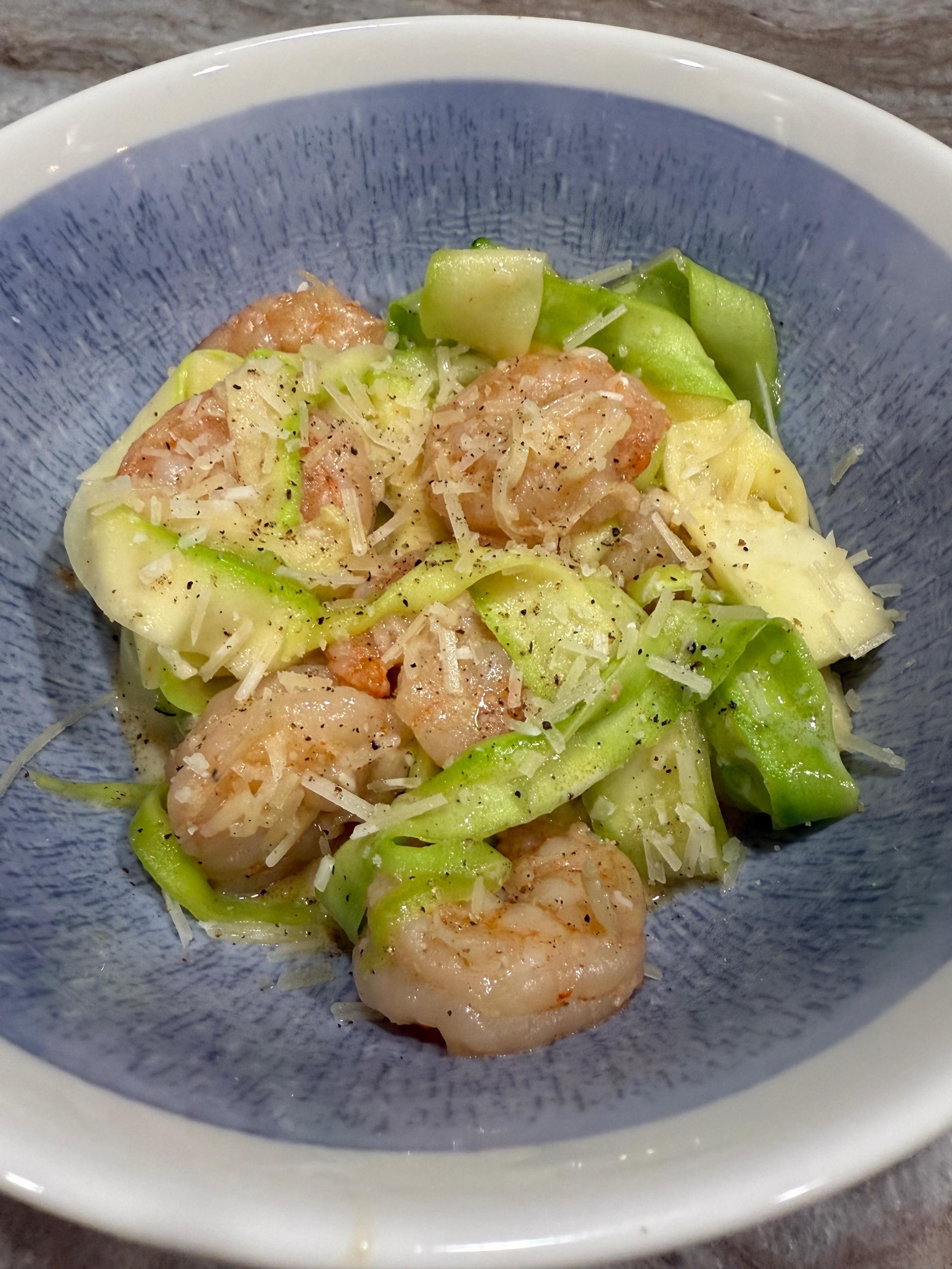 @Shelby mentioned zoodles recently, which reminded me I haven’t had them in a while. Despite buying the zucchini specifically to make zoodles, I was too lazy to get out the zoodle maker, and used a veg peeler to make zucchini ribbons. Turns out I like the ribbons better than the noodles, so my laziness paid off. Shrimp scampi.