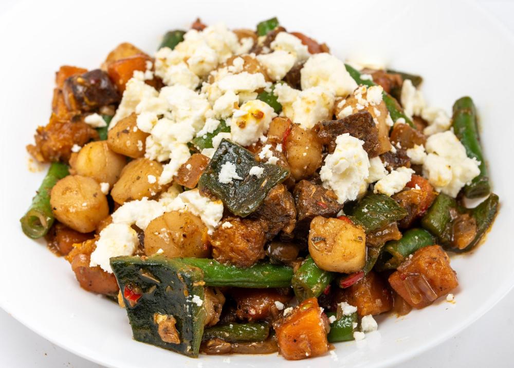 Bay scallops, Merguez sausage, green beans, and baby butternut squash, each separately seared and removed. Deglazed the pan, sauteed onion, garlic, and bird chiles, then finished with roasted Poblano chile, black pepper, fish sauce, Mexican oregano, thyme, garam masala, a splash of half-and-half, and crumbled feta. Lovely, spicy, complex mix of textures and flavors.