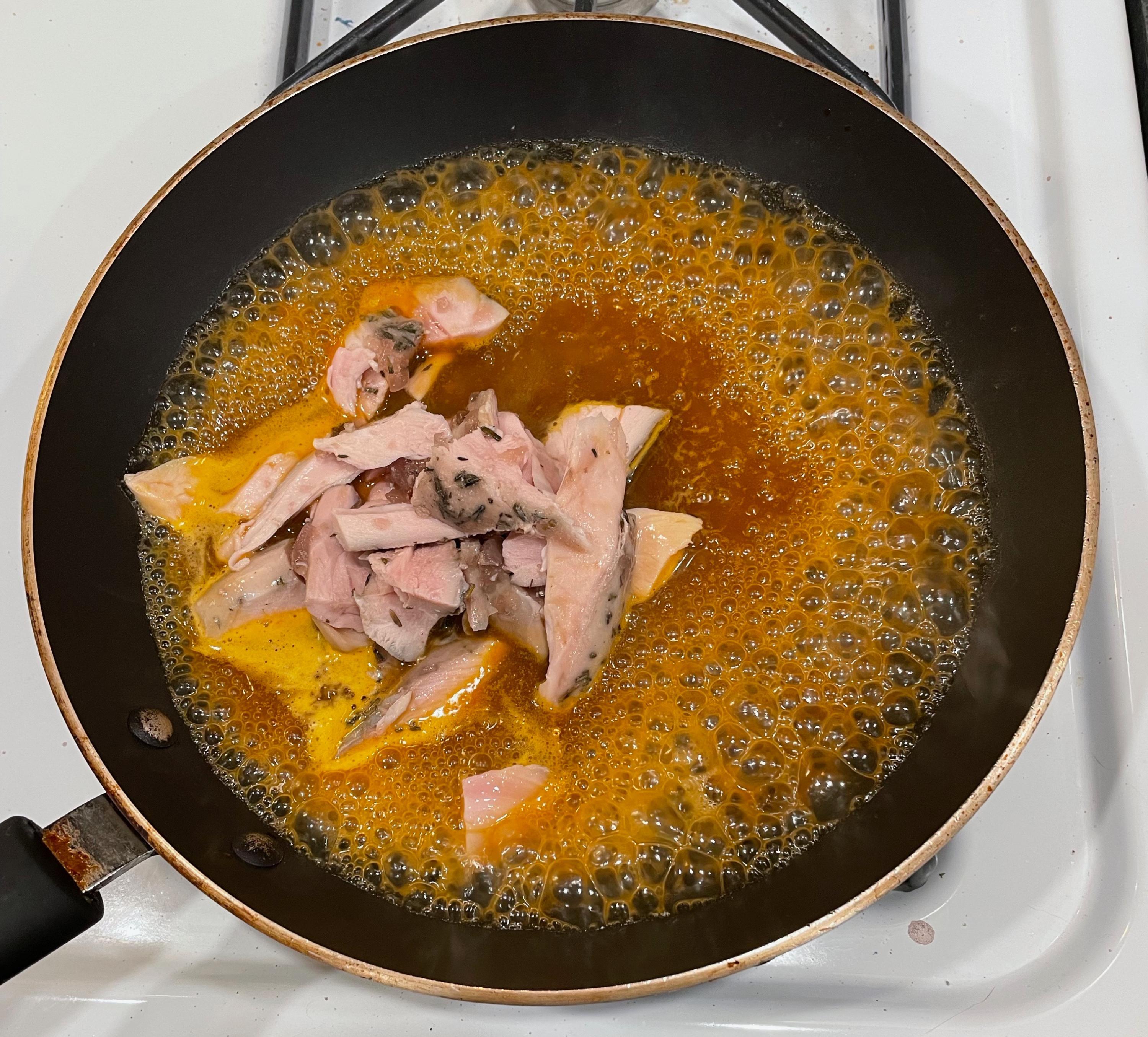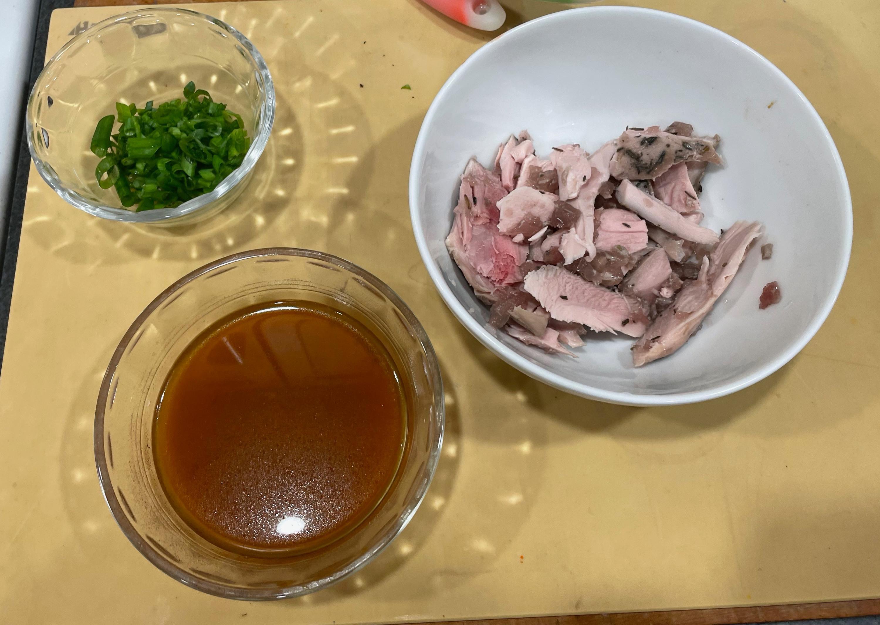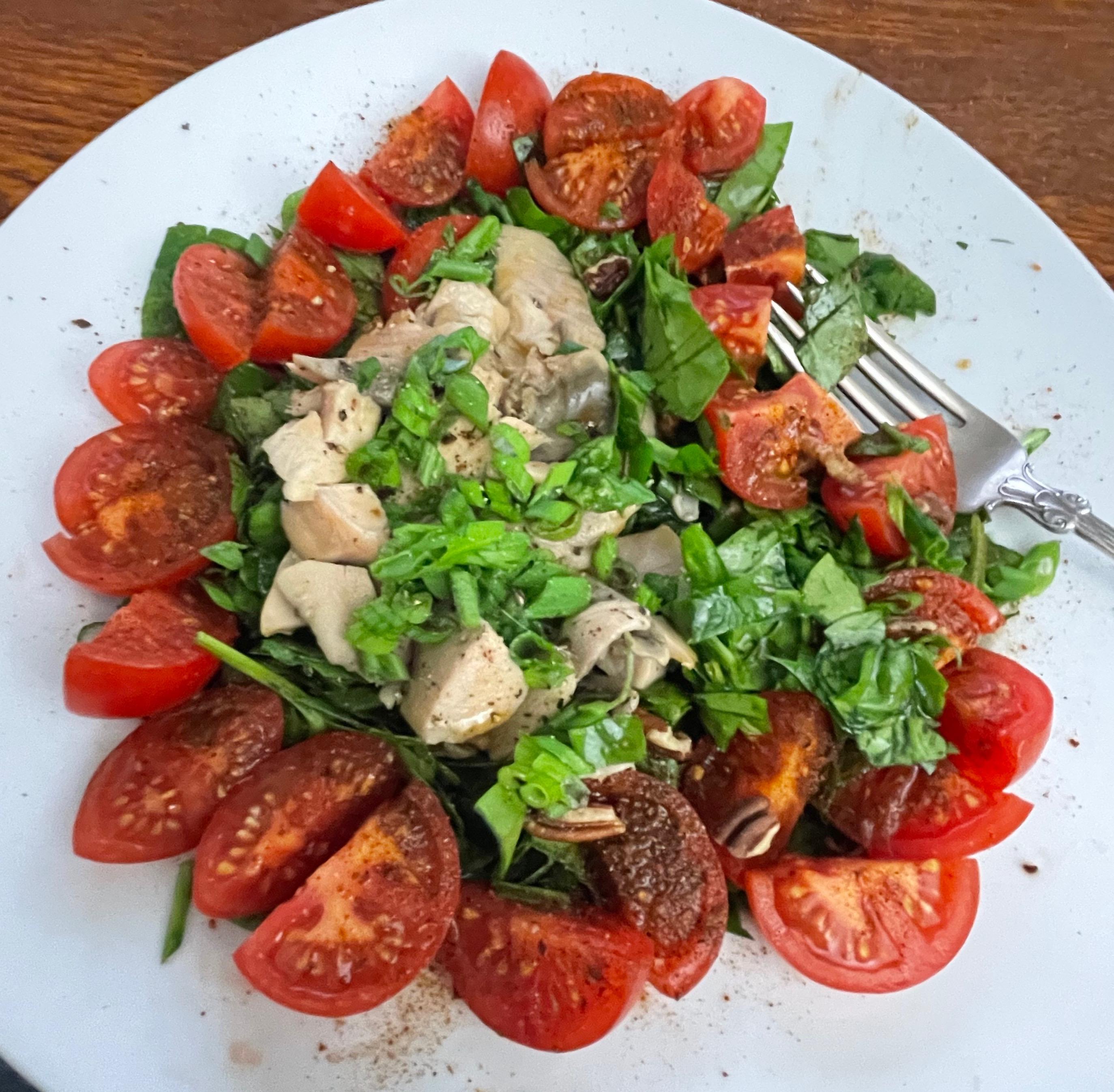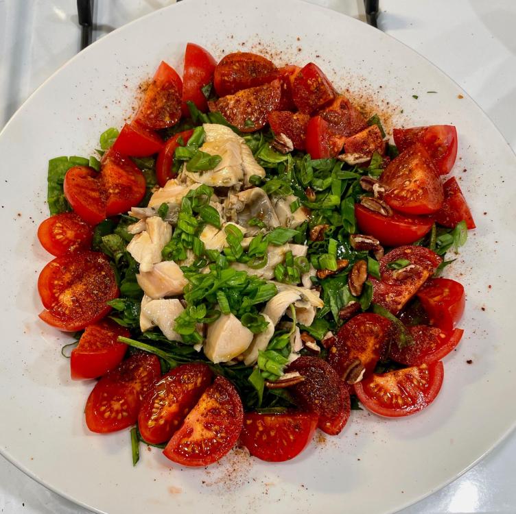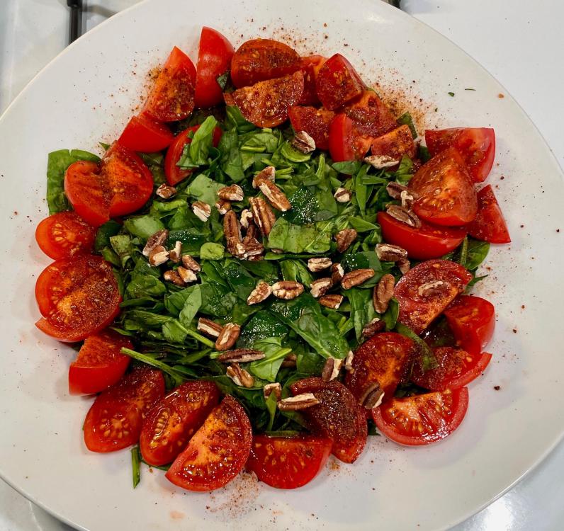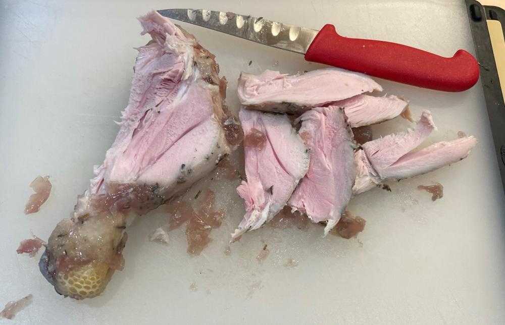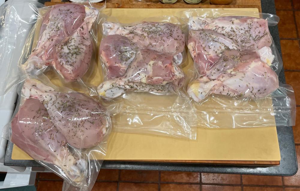 a while back , I SV'd some plump CkLegs , from a S&S sale https://forums.egullet.org/topic/154537-what-are-you-cooking-sous-vide-today-part-3/page/87/ here they are , pre-SV. didnt take a pic p-SV. they look pretty much the same , except for some very flavorful gel in the pacs: one drum w some of the meat sliced off Note the chicken jelly . more meat sliced off . the upper L is for MC . he goes crazy for it. Ill scape off the bone later , and add that to MC's portion. Id give him the bone , which he would enjoy , but it coated w jell , and he would carry the bone around to find the exactly perfect place to enjoy it. A rug usually . My standard Campari // Spinach // pecan // EVOO plate , w Penzey's Pico & Fruta on the Campari's TJ's Coastal Chard // demi-glace // a little Wondra lower pyrex bowl . in a hot pan goes the wine/demi and the chicken. very briefly Placed : Eating this was very very good . the SV CkDrum meat was very tender , pick , and moist. a winner way for me to set up CkDrums. the wine/demi can be varied each time w other flavors : Curry powder ? etc ? etc ? the base of Campari // spinach is a staple of dinners here. Tonights dinner will be the same , but Ill try my TJ's red table wine .