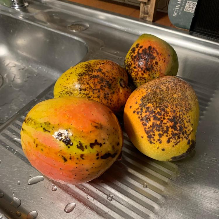 It’s mango season here. The skin looks a bit poxy, but who eats the skin. None are reachable to pick, so we wait until they fall and cut out any bruises. We share with possums and flying foxes too. The largest of these weighs 650g.