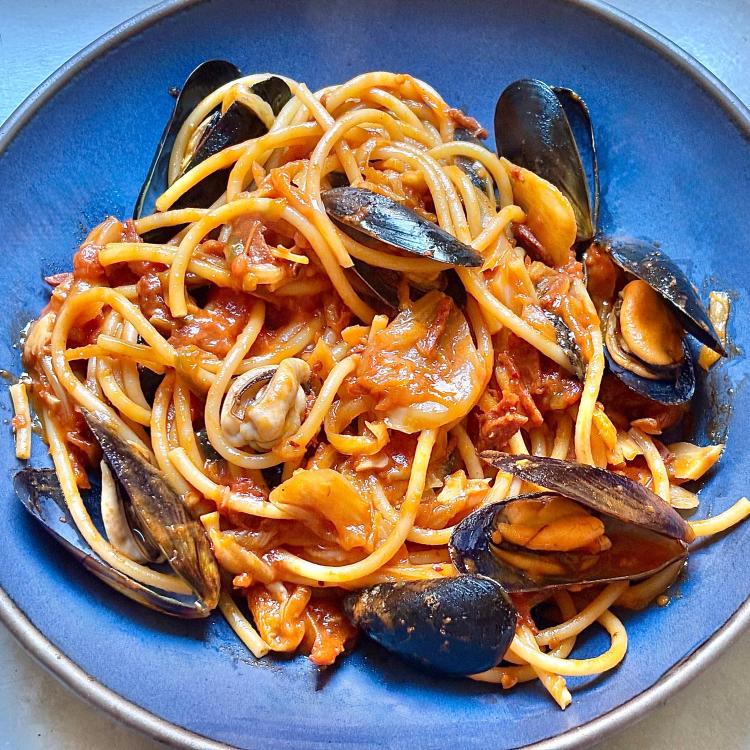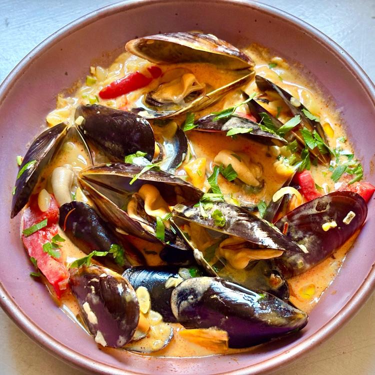 Mussels and orzo in a coconut and saffron stew from Mezcla by Ixta Belfrage. I loved this and will absolutely make it again. I used Thai bird chiles instead of Scotch bonnet and red bell pepper instead of yellow. The Calabrian chile paste was a great addition.