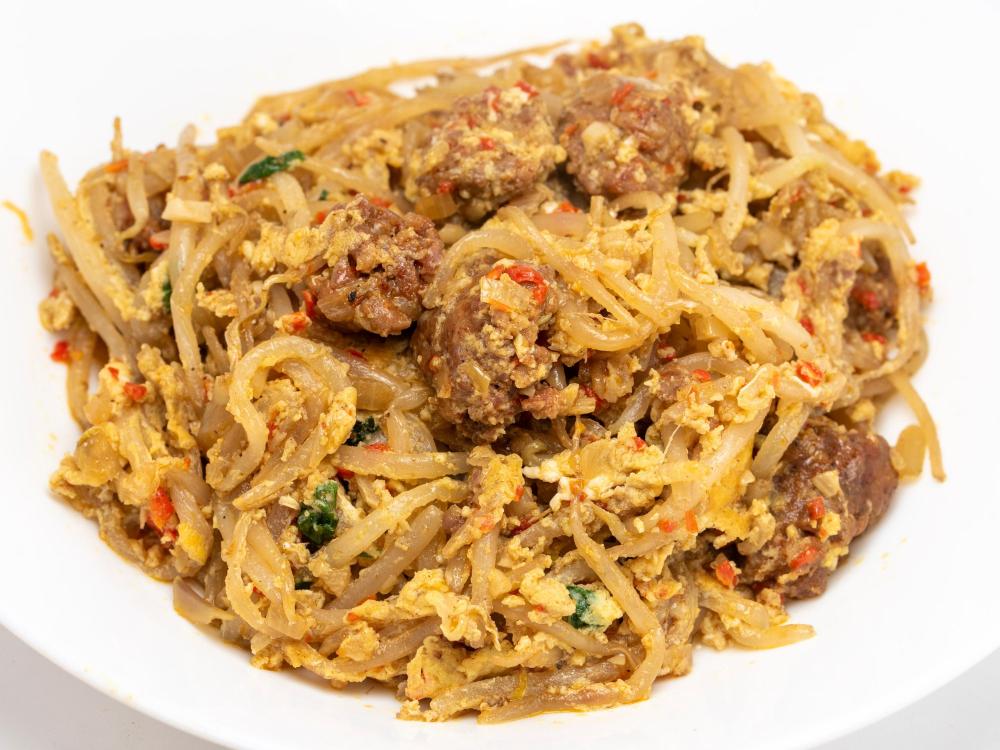 Bean sprouts, Mexican chorizo, and eggs with shallots, garlic, and red chiles. Fish sauce, cumin, black pepper, and garam masala for flavor.