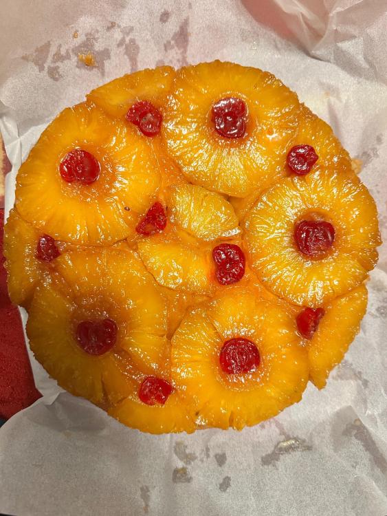 Pineapple Upside Down Cake for my aunt Joyce’s birthday. She is shocked I used a fresh pineapple 😁. I guess she never thought of it 🤷♀️ -