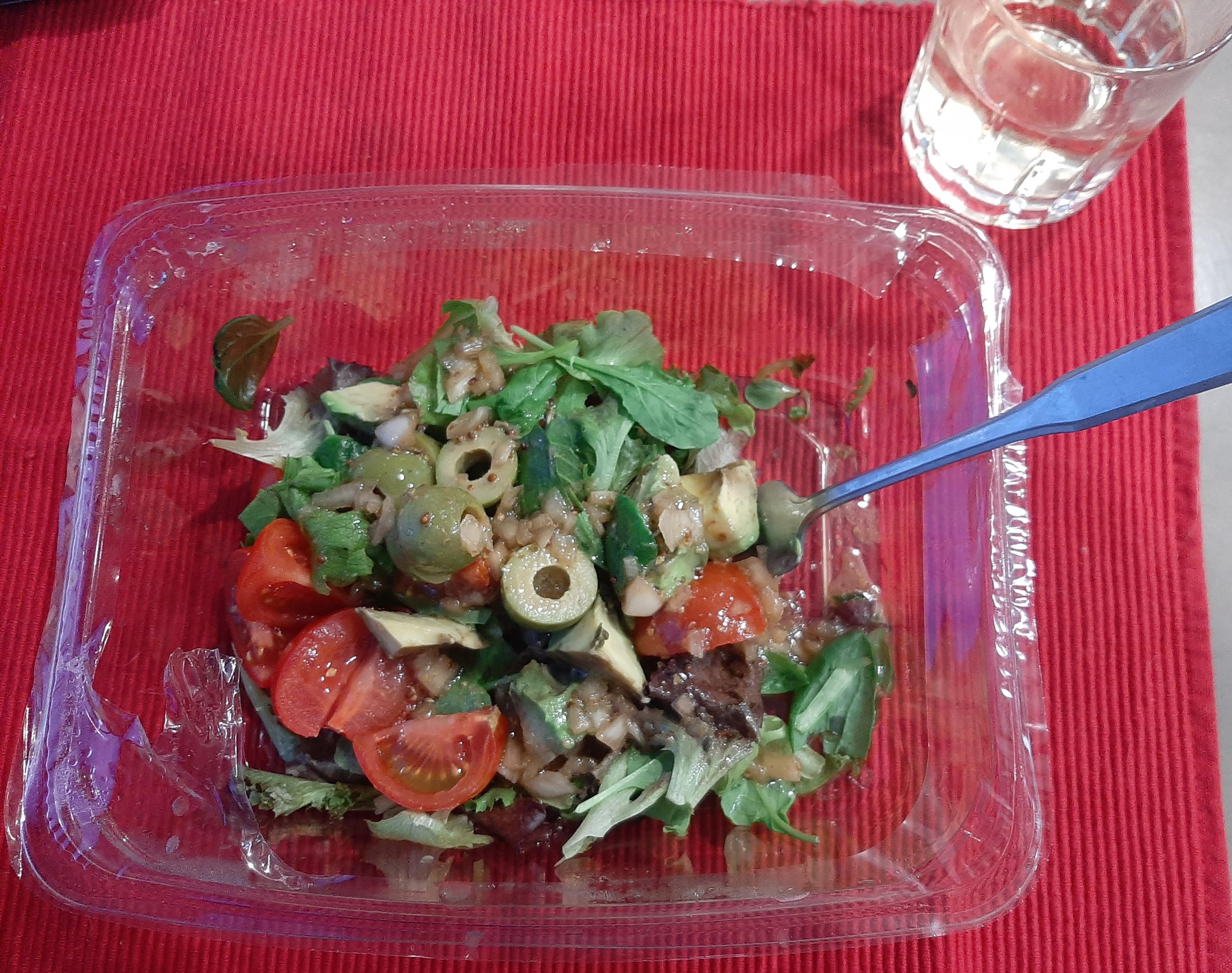 @blue_dolphin, that story took me through chills and shivers (I grew up near the Sierras and know those roads) and laughs and admiration! Too bad about the Awahnee, but good on you for the entire adventure! My "jury rigged" system wasn't as dire. For reasons that I don't fully understand, and need to call about, the mobile repair folks "fixed" the problem, temporarily at least, by switching the "in" and "out" wires for the glide. So far it seems to be working, instead of jamming cockamamie in the frame as it had been. I've been able to move on. The Greek Chicken salad in a "shakeable bowl" turns out to be exactly as @chromedome described. After shaking the mixture (without explosions, splashing or other culinary disasters) it looked like this: If I'd made this salad I think I'd have torn, chopped or cut the greens finer, but the flavors were excellent and the salad was a fine dinner. More than one type of lettuce and olives; pepperoncini; chicken breast that wasn't dried out; tomatoes; cucumbers; shredded cabbage; feta cheese. No doubt I've forgotten a few things. There was a gracious plenty of dressing. All told, I'm pleased with this dinner.