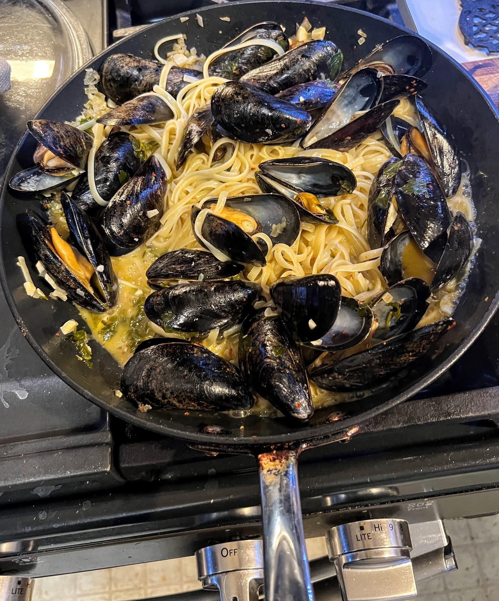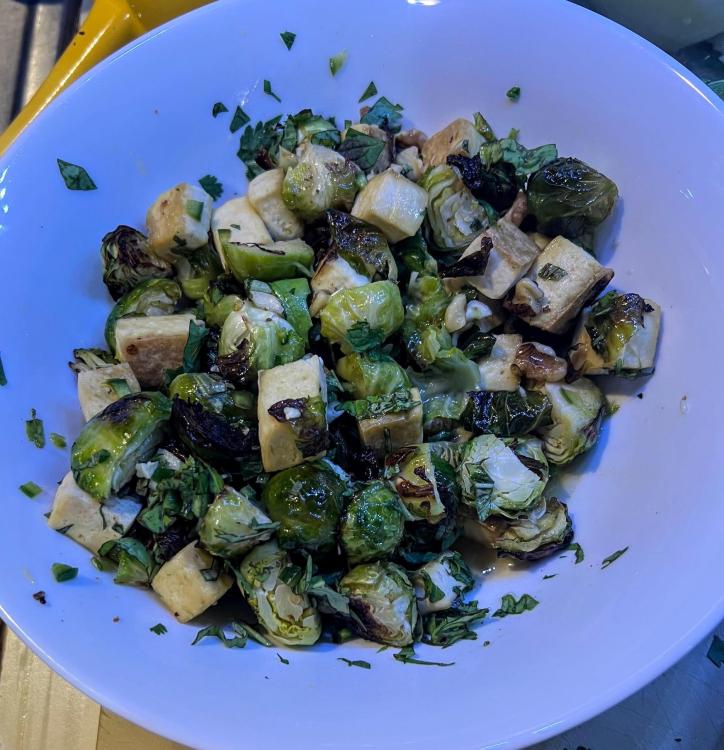 Charlie found a recipe that looked like it was similar to a mussels appetizer he always ordered at an Italian restaurant but it isn't on the menu anymore. He said it tasted just like it but it didn't come with pasta but it was good cooked in the sauce until it was absorbed. I was cooking the Brussels sprouts first and he thought it was the only thing we were having. He was relieved to find it was just a side. I am not a fan of tofu, generally, but is was good roasted with the the garlicky seasonings.