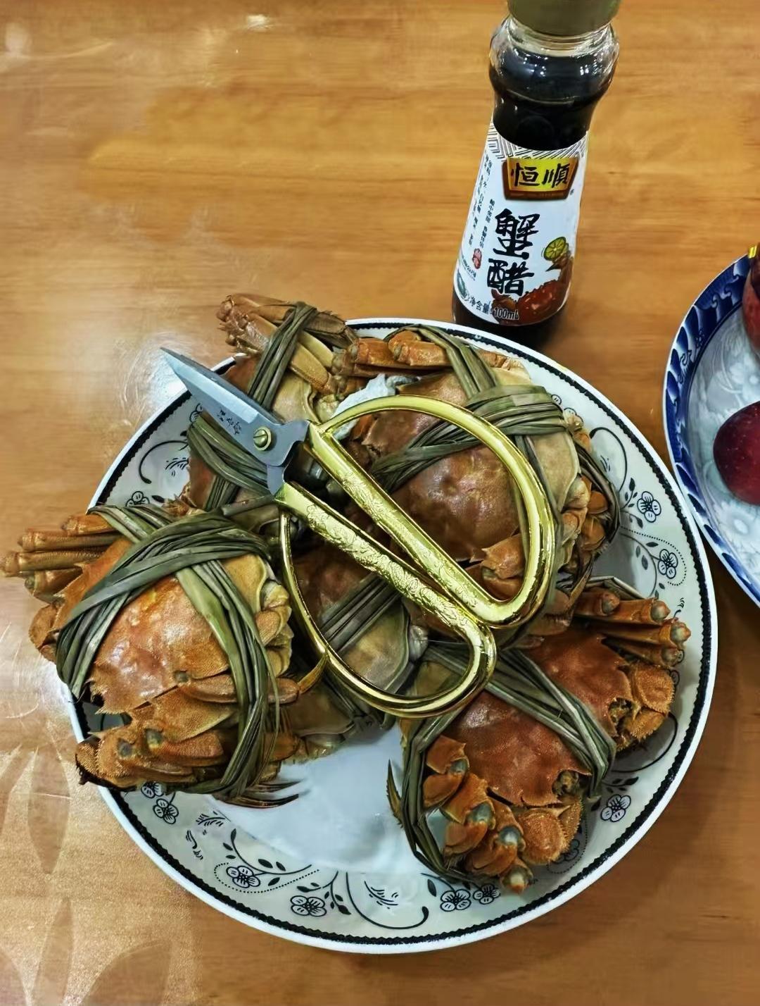 Another day; another lunch 大闸蟹 (dà zhá xiè), mitten crabs aka hairy crabs. With 蟹醋 (xiè cù), crab vinegar for a dip (in the bottle).