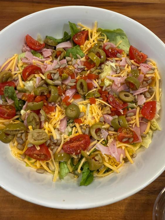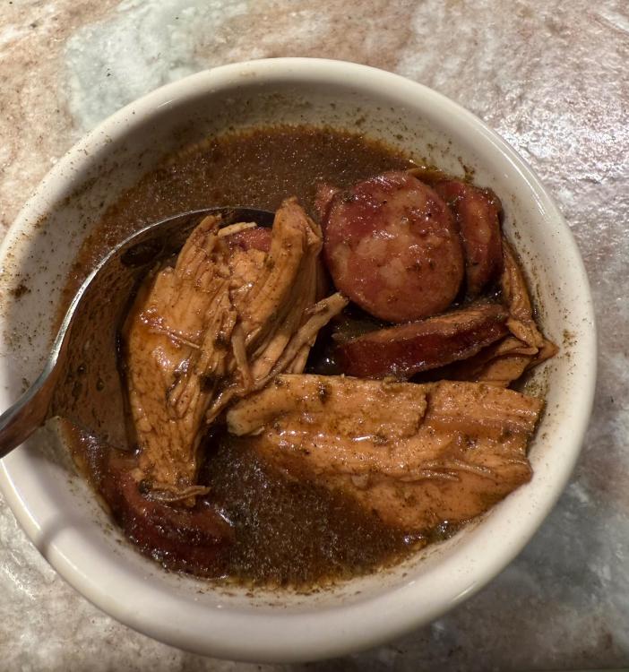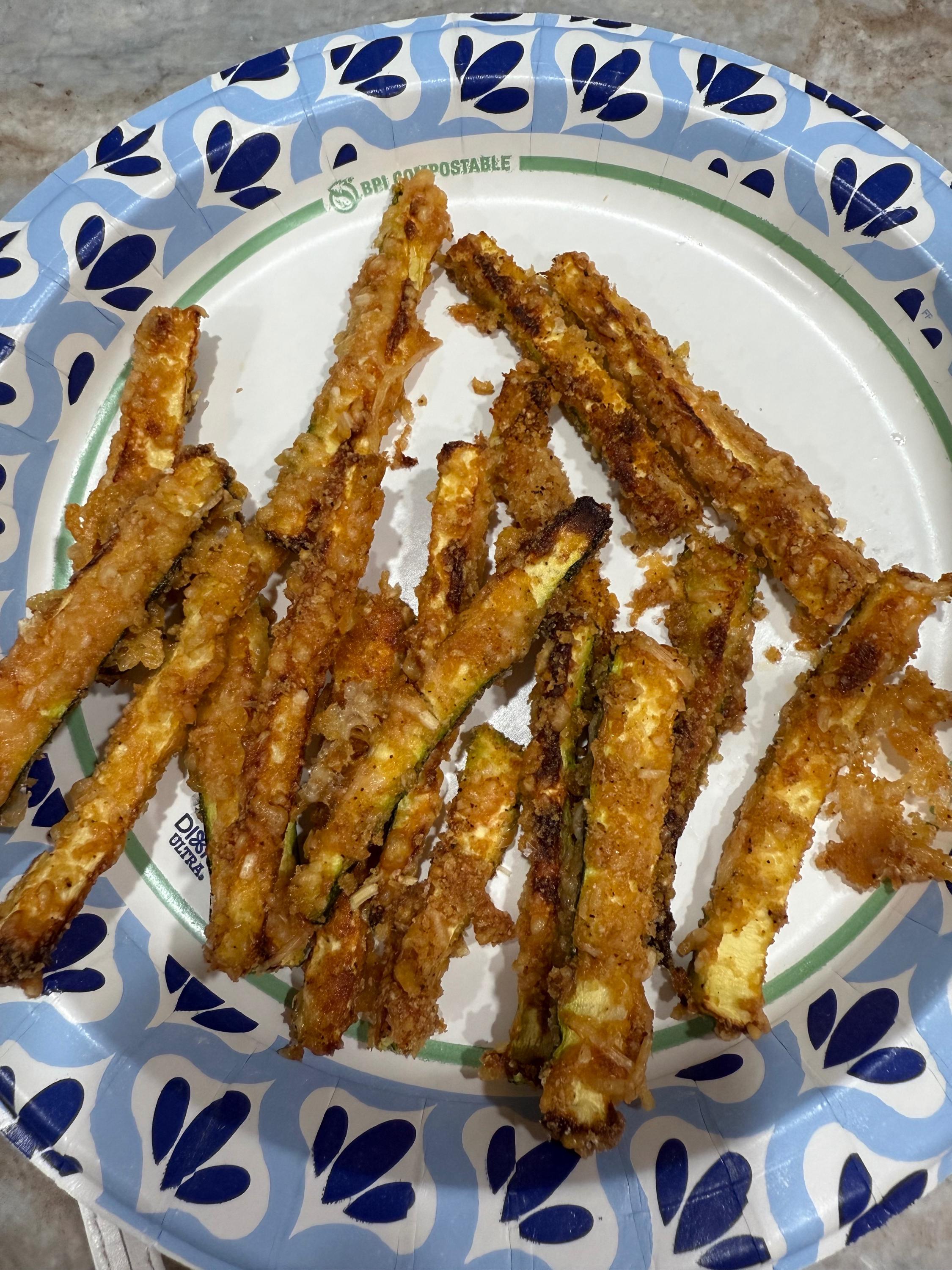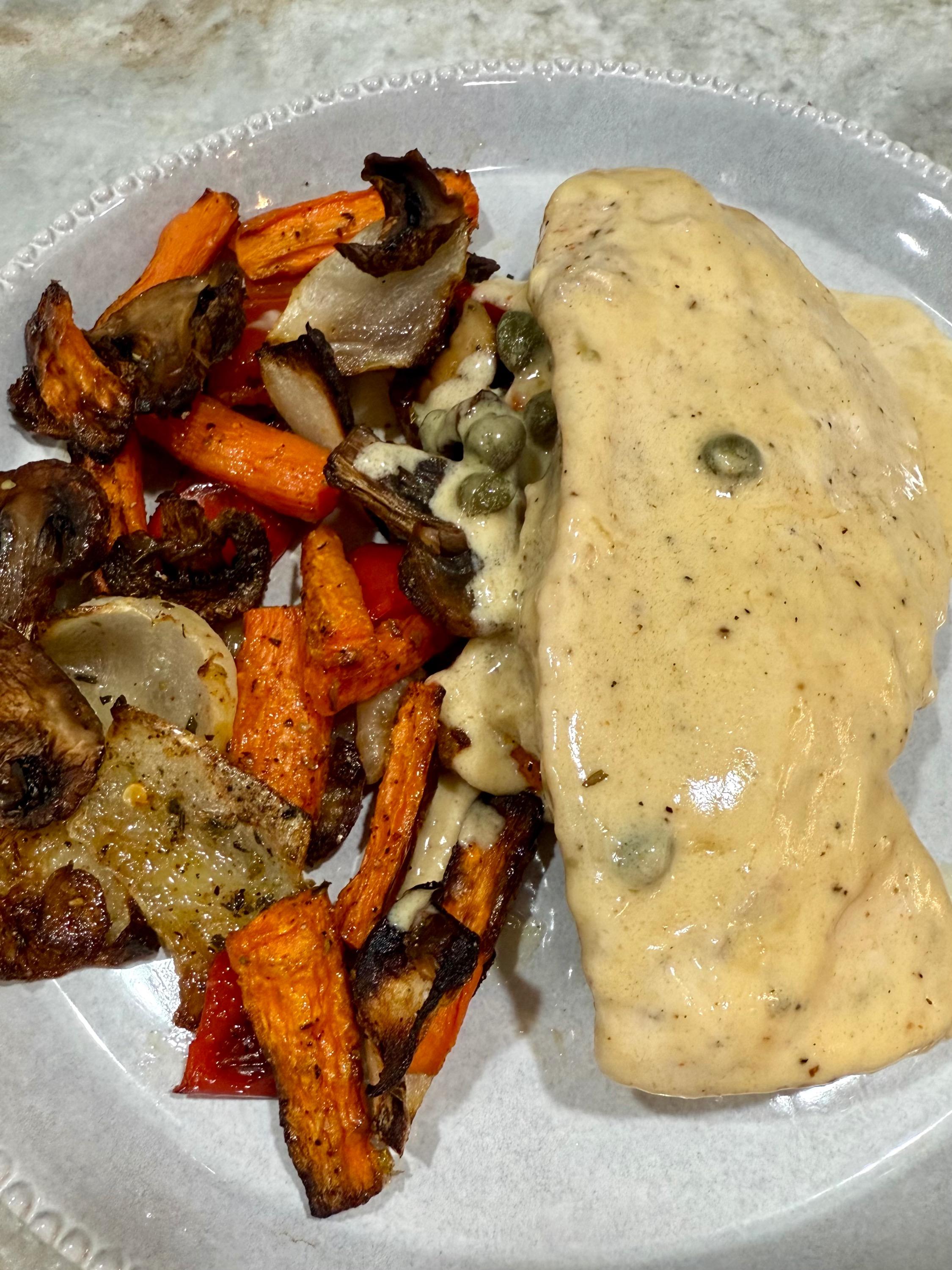 Chicken with lemon butter caper sauce and roasted veg (carrots, mushrooms, onion, red bell pepper). Ladled more sauce over the veg after the pic. So good! A few nights ago, a very mismatched meal of air fryer zucchini fries and a cup of chicken and sausage gumbo. Each element was good! The zucchini needed using and it did not die in vain. Dinner salad.