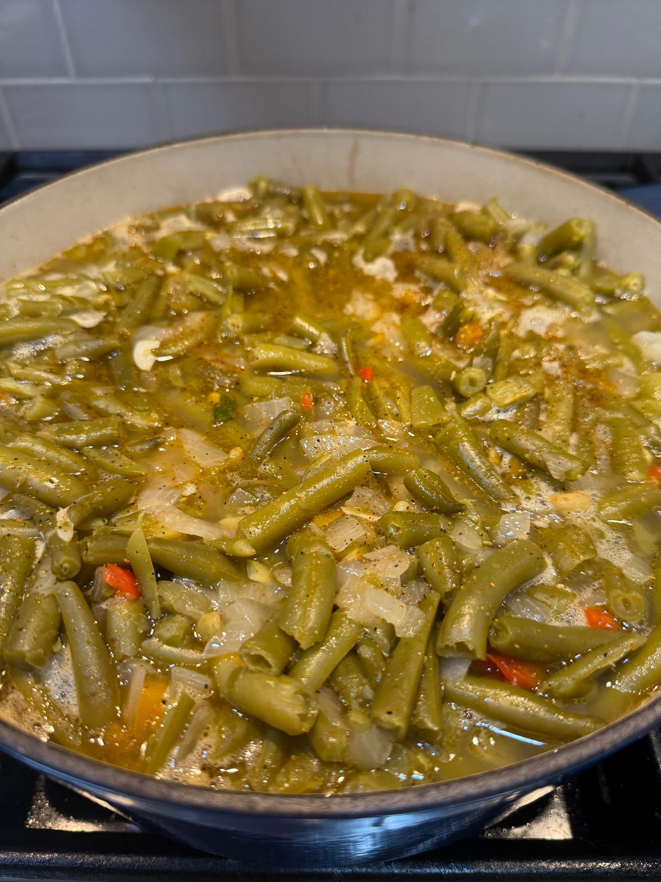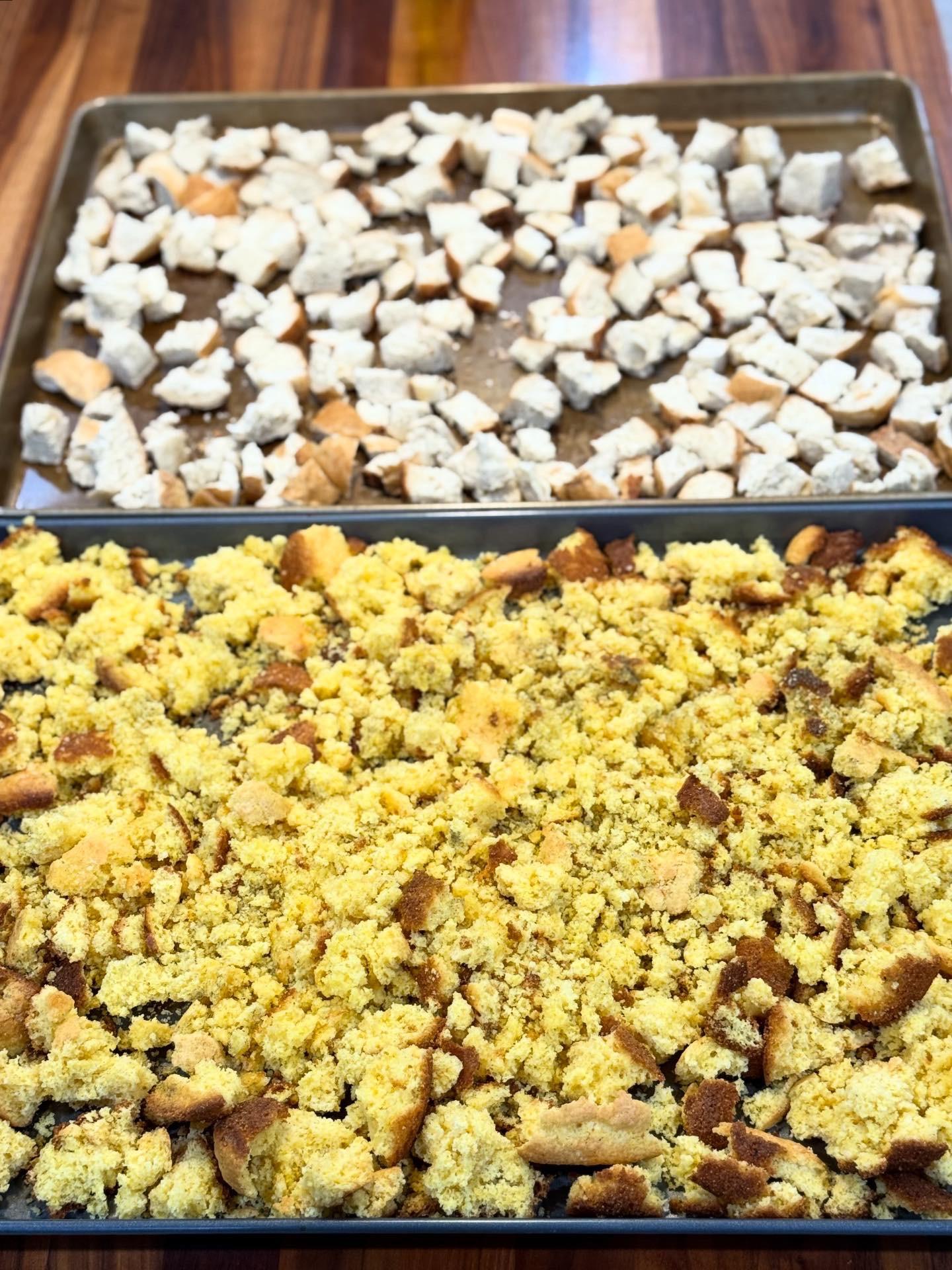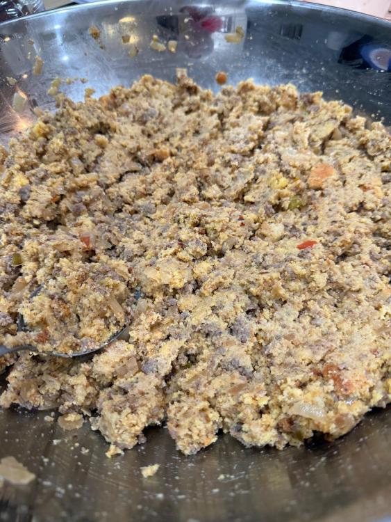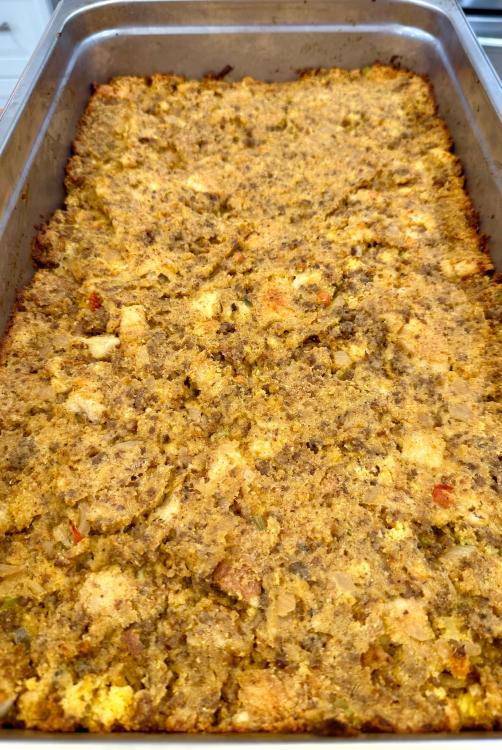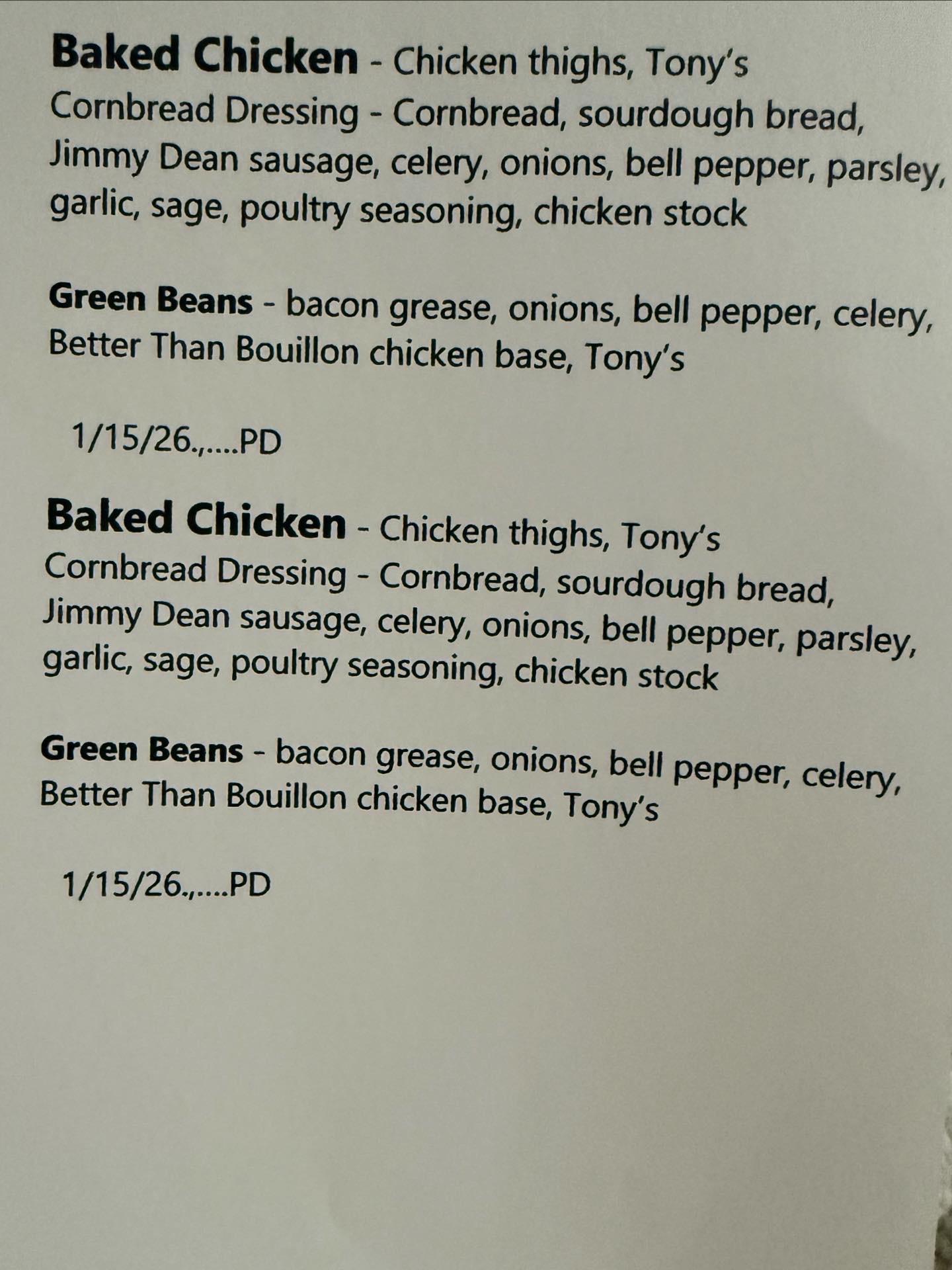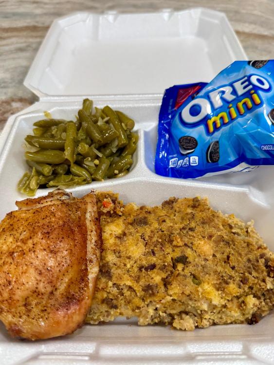 I’d love to say there were no hitches in this week’s CFM, but I can’t. Just after the labels were made and it was almost time for plating, my husband informed me we only had 7 of the three compartment to go containers left! We had plenty of the single compartment containers, but I didn’t want to use them. Costco is less than a mile away, but neither of us was prepared to go. How lucky that we managed to get an Instacart delivery within 20 minutes of realizing the problem? Had to pay $1 extra for faster delivery, but problem solved almost painlessly. Yay! Cornbread was made (more than pictured), and sourdough was purchased. Both were dried out in the oven Jimmy Dean sausage, browned, along with the trinity, plus extra celery. Combining the meat mixture, cornbread, sourdough, and chicken stock. Seasoned with Tony’s, poultry seasoning, plus a little extra sage and thyme. I added four eggs to each pan of dressing for binding. And after baking. There were two pans. I baked at 350, covered, for 45 min. Removed the foil at 45 min, and decided to moisten with more stock, returning the pans to the oven, uncovered, for 15 more minutes. For the green beans, I started with bacon grease from the crock I keep in the fridge. Softened the veg. Added the canned green beans, a few tablespoons of Better than Bouillon chicken base, and seasoned with Tony’s. Not much to say about the chicken! Seasoned and baked at 400 for 45 minutes. The tray on the bottom rack was moved to the top and cooked about 15 minutes longer to even out the browning. One tray pictured. Dessert The plated meal. I try very hard not to say anything when my husband changes capitalization or punctuation or uses random bolding. But if you bold baked chicken and green beans, why not cornbread dressing? And why not be consistent with spacing between items. AND WHY NOT JUST COPY AND PASTE EXACTLY AS SENT?! (Can you tell which of us is the nice guy and which is a controlling um, person?) Regardless, success!
