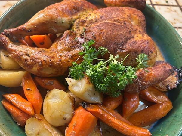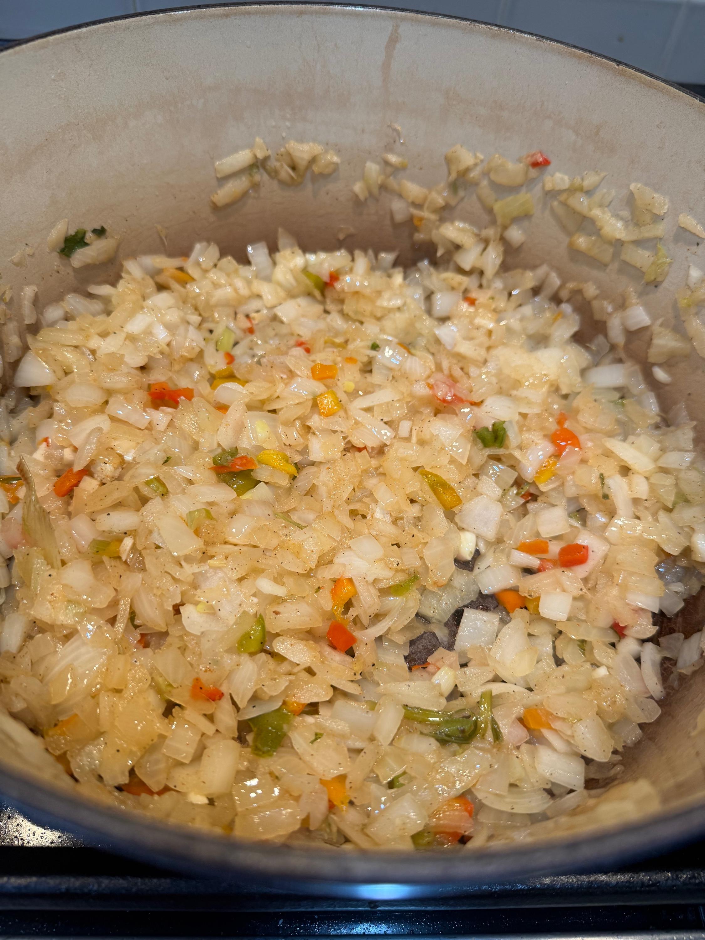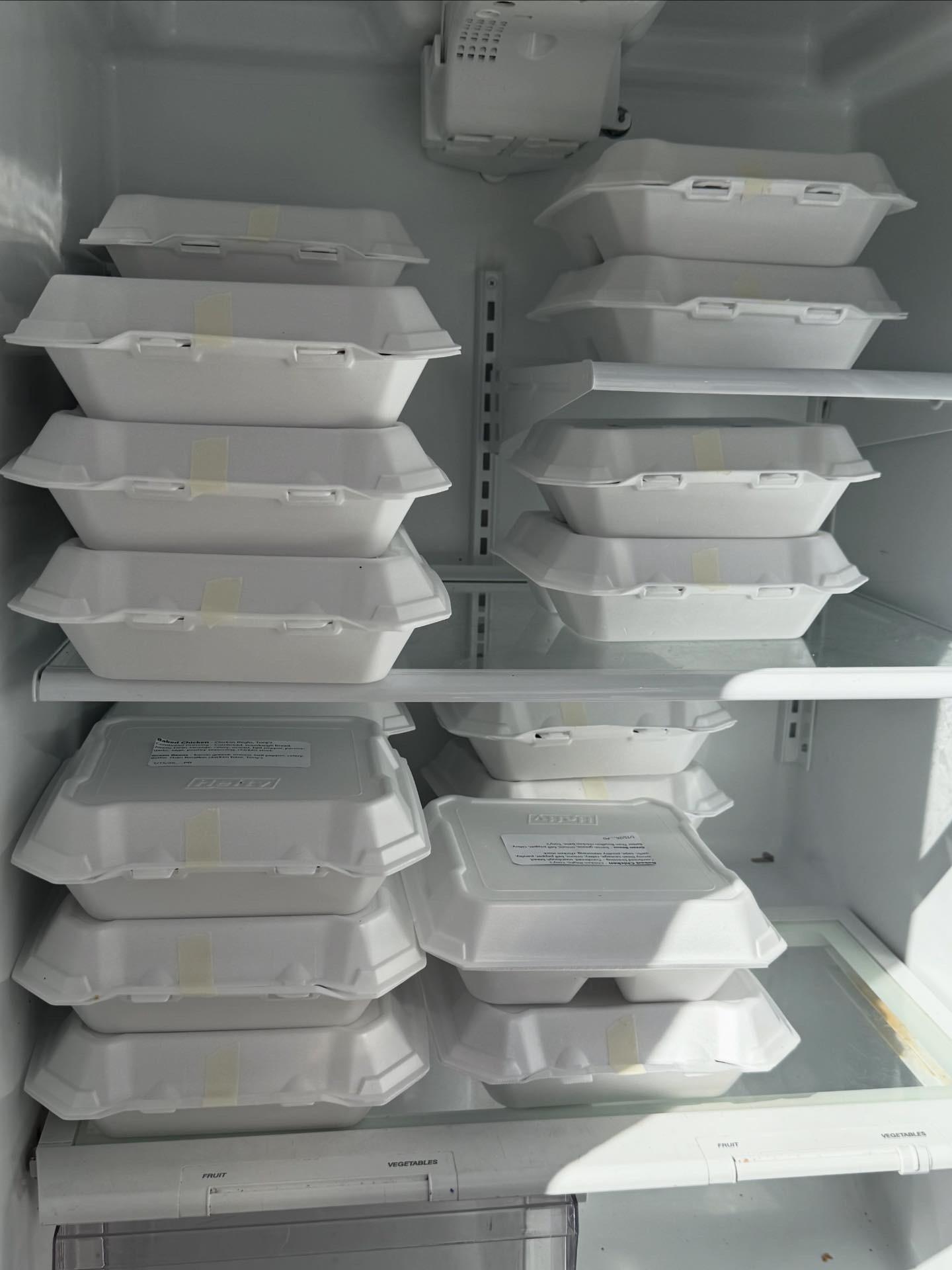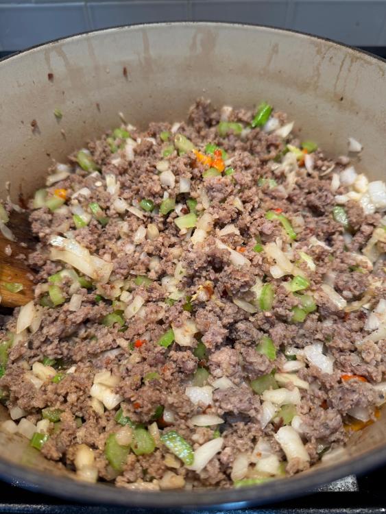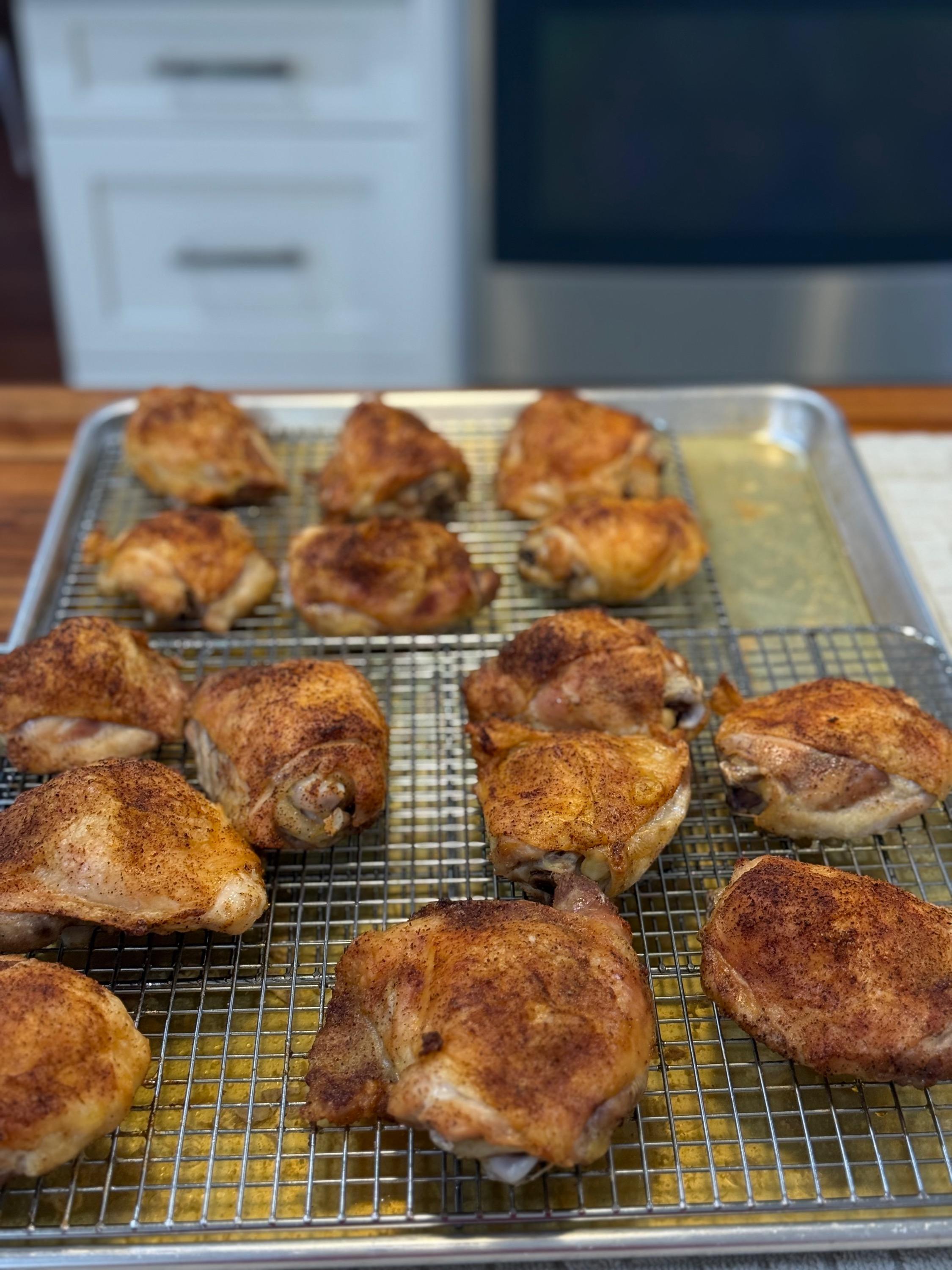 I’d love to say there were no hitches in this week’s CFM, but I can’t. Just after the labels were made and it was almost time for plating, my husband informed me we only had 7 of the three compartment to go containers left! We had plenty of the single compartment containers, but I didn’t want to use them. Costco is less than a mile away, but neither of us was prepared to go. How lucky that we managed to get an Instacart delivery within 20 minutes of realizing the problem? Had to pay $1 extra for faster delivery, but problem solved almost painlessly. Yay! Cornbread was made (more than pictured), and sourdough was purchased. Both were dried out in the oven Jimmy Dean sausage, browned, along with the trinity, plus extra celery. Combining the meat mixture, cornbread, sourdough, and chicken stock. Seasoned with Tony’s, poultry seasoning, plus a little extra sage and thyme. I added four eggs to each pan of dressing for binding. And after baking. There were two pans. I baked at 350, covered, for 45 min. Removed the foil at 45 min, and decided to moisten with more stock, returning the pans to the oven, uncovered, for 15 more minutes. For the green beans, I started with bacon grease from the crock I keep in the fridge. Softened the veg. Added the canned green beans, a few tablespoons of Better than Bouillon chicken base, and seasoned with Tony’s. Not much to say about the chicken! Seasoned and baked at 400 for 45 minutes. The tray on the bottom rack was moved to the top and cooked about 15 minutes longer to even out the browning. One tray pictured. Dessert The plated meal. I try very hard not to say anything when my husband changes capitalization or punctuation or uses random bolding. But if you bold baked chicken and green beans, why not cornbread dressing? And why not be consistent with spacing between items. AND WHY NOT JUST COPY AND PASTE EXACTLY AS SENT?! (Can you tell which of us is the nice guy and which is a controlling um, person?) Regardless, success!
