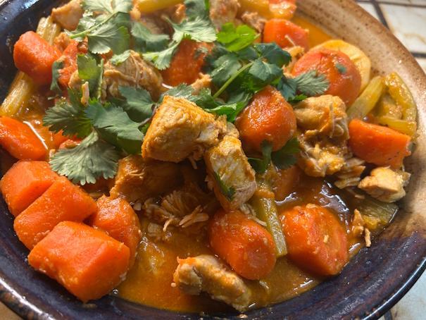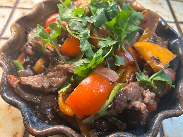 Ginger chicken: Saute sliced chicken thigh meat with garlic, then mix in sliced onion, slivered ginger, oyster sauce, fish sauce, white pepper, sugar, sliced Shiitake mushrooms, and a mix of sliced peppers (red bell, roasted Poblano, and Cubanelle). Finished with cilantro. Mrs. C made a sweet potato salad with pecans, dried cranberries, dried black currants, feta cheese, and a champagne vinegar dressing.