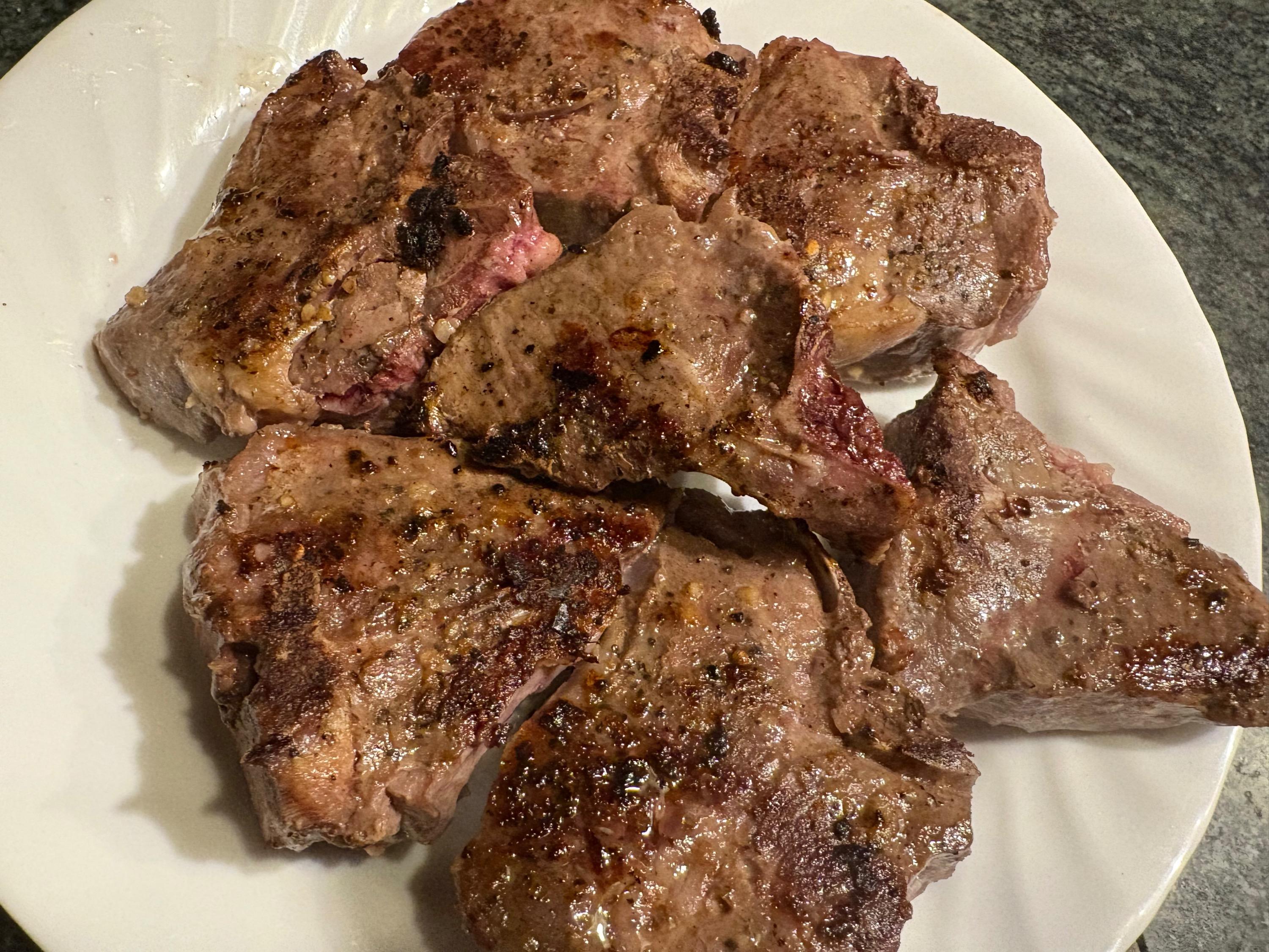 We had what we call lamb cutlets with mash potato and ”greens”. I “Frenched” the cutlets to take the fat off the long bone and each became a tender two mouthfuls.
