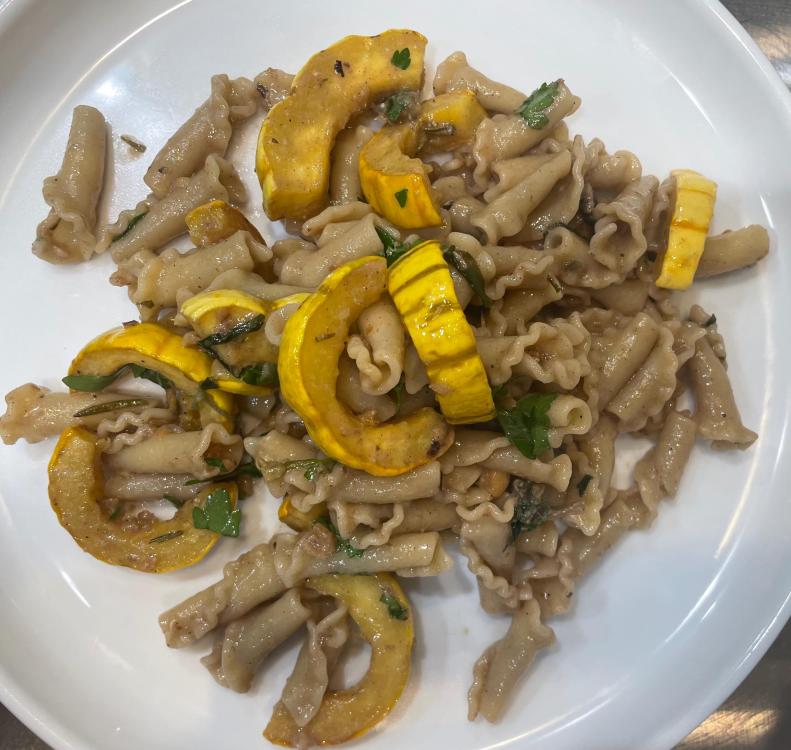 Campanelle with Squash, Walnuts, and Sage Brown Butter from “Anything’s Pastable” - delicata squash is roasted in the oven with rosemary. Sage leaves, crushed walnuts, garlic and red pepper flakes are sautéed in butter and used as a base for the sauce with pasta water, parmesan, lemon juice and zest as well as parsley. Everything is then mixed with the campanelle and finished with more parsley and parmesan