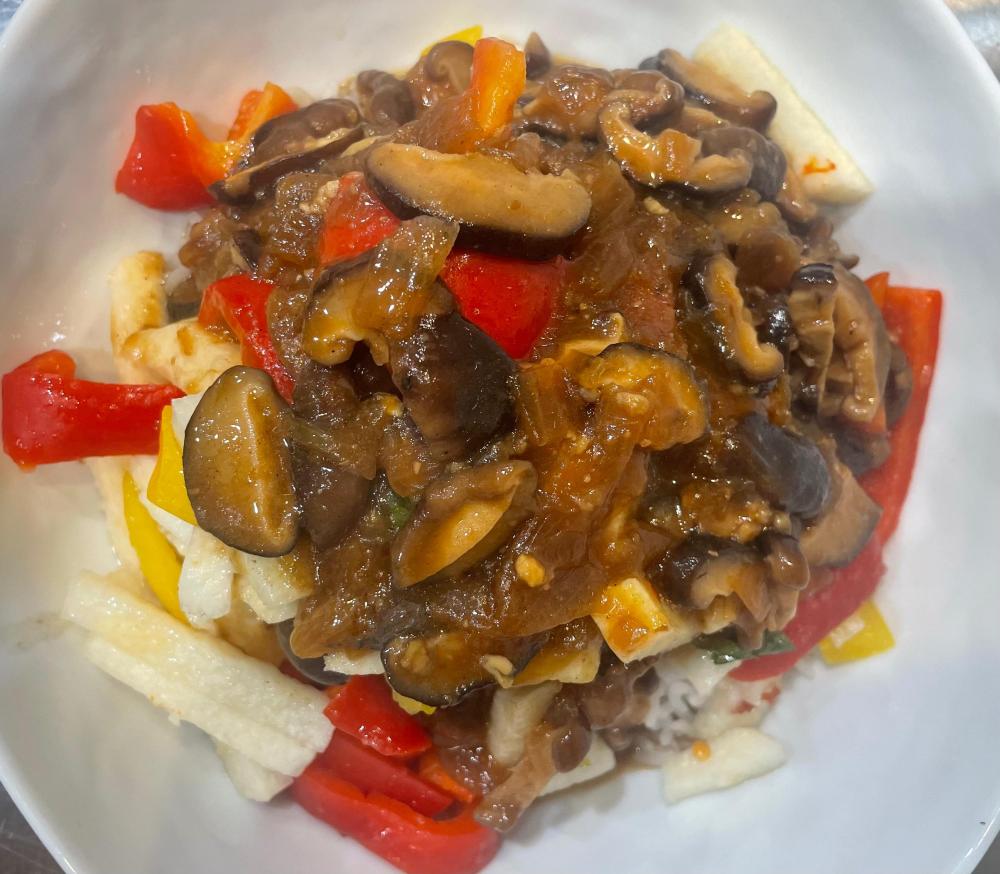 Miso-Smothered Chicken with Pineapple-Pickled Jicama from “Smoke & Pickled” by Edward Lee - the bone-in chicken thighs are braised in a mixture of caramelized onions, flour, garlic, red miso, cayenne pepper, bourbon, orange juice, chicken broth and soy sauce. Sliced shiitake mushrooms are added towards the finish. Jicama, red and yellow bell peppers are pickled for two days on a mixture of pineapple juice from fresh pineapple, white wine vinegar, sugar, red pepper flakes, star anise, cloves and mint. Served over rice