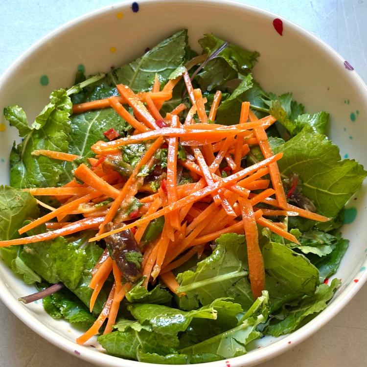 A simple carrot salad from Good Things. Kind of a riff on the classic carrot-raisin salad. This one tosses the carrots with dates, fresh ginger, garlic, ground cumin, cilantro and pickled Thai chiles, then adds a quick dressing of olive oil, lime juice, chile vinegar (from the Thai chiles) and salt. I piled the salad on a bed of baby kale that I dressed with the same dressing. This wasn’t a meal salad, I had it alongside a salmon burger for lunch.
