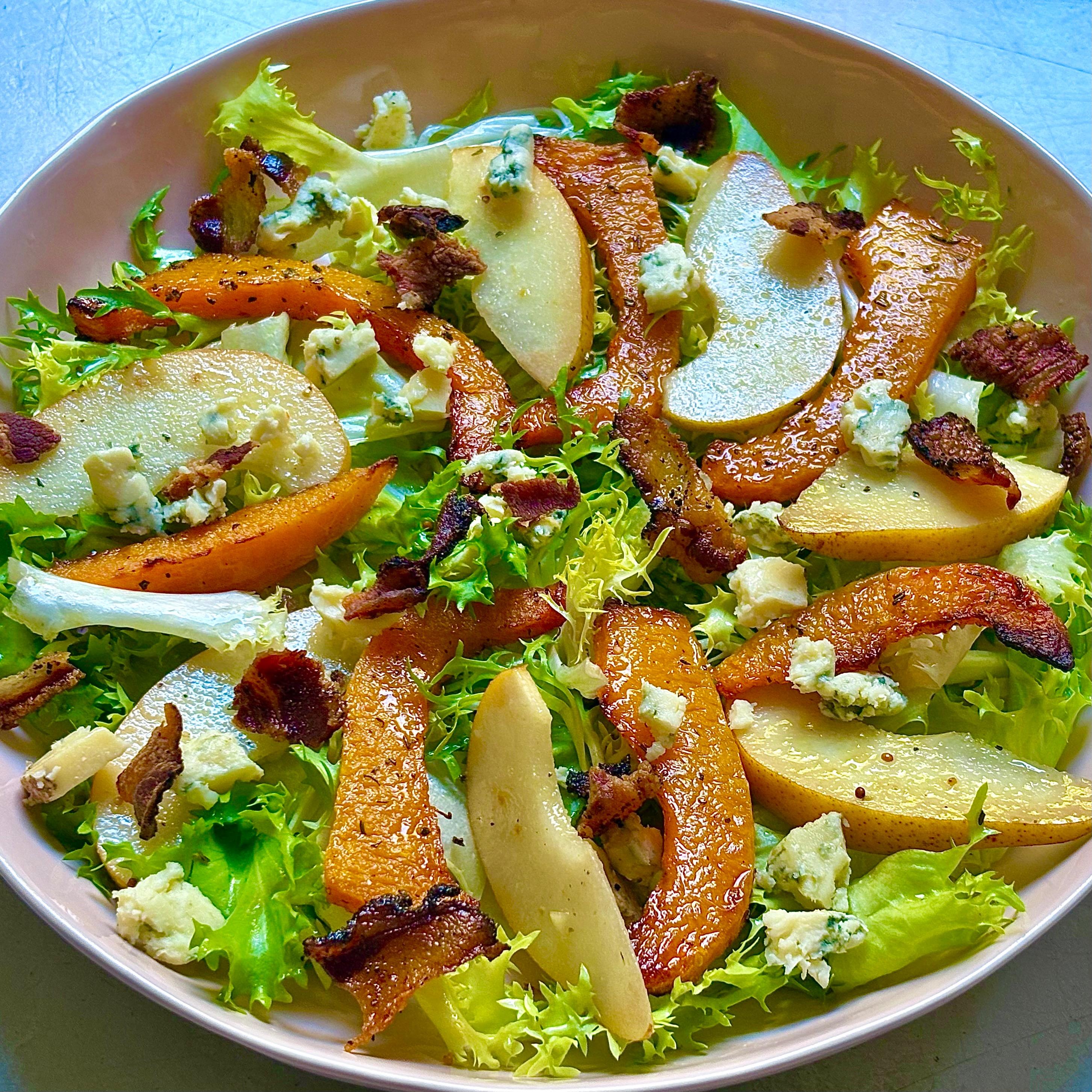 Roasted butternut squash salad with pears and Stilton from Fine Cooking magazine (RIP) The recipe called for bacon but I was out so I used guanciale and I pretty much ignored the plating instructions.