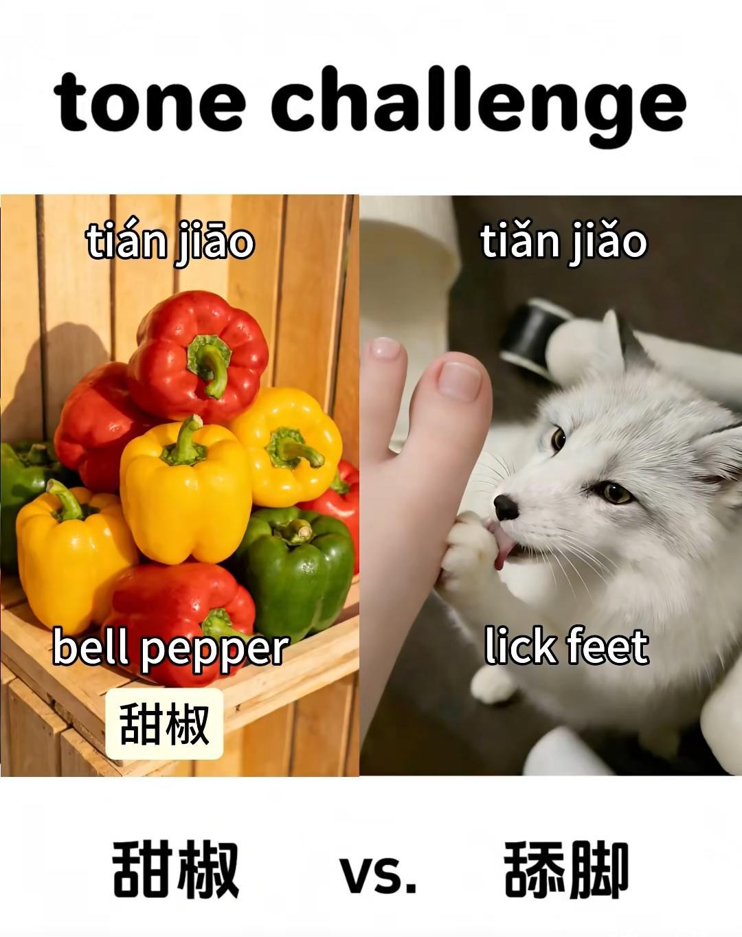 Like many other languages, Mandarin Chinese is tonal. This means that each syllable is assigned one of five tones. Other syllables with otherwise the same pronunciation will often have different tones. These tones are important. Get the tone wrong and you change the meaning. This can be embarrassing in that while you intend saying something inconsequential, you actually come out with something shocking or amusing. One that I hope is deliberate (I know it isnt) is food related. Bell peppers, the most pointless vegetable ever are, in Mandarin 甜椒 (tián jiāo). The first syllable, tián, has a rising tone while the second has a high flat tone. Accidentally change both tones to falling then rising and you've changed the meaning to the verb 'to lick feet', something more flavourful! There are many more food related examples which I will put here as I come across them.