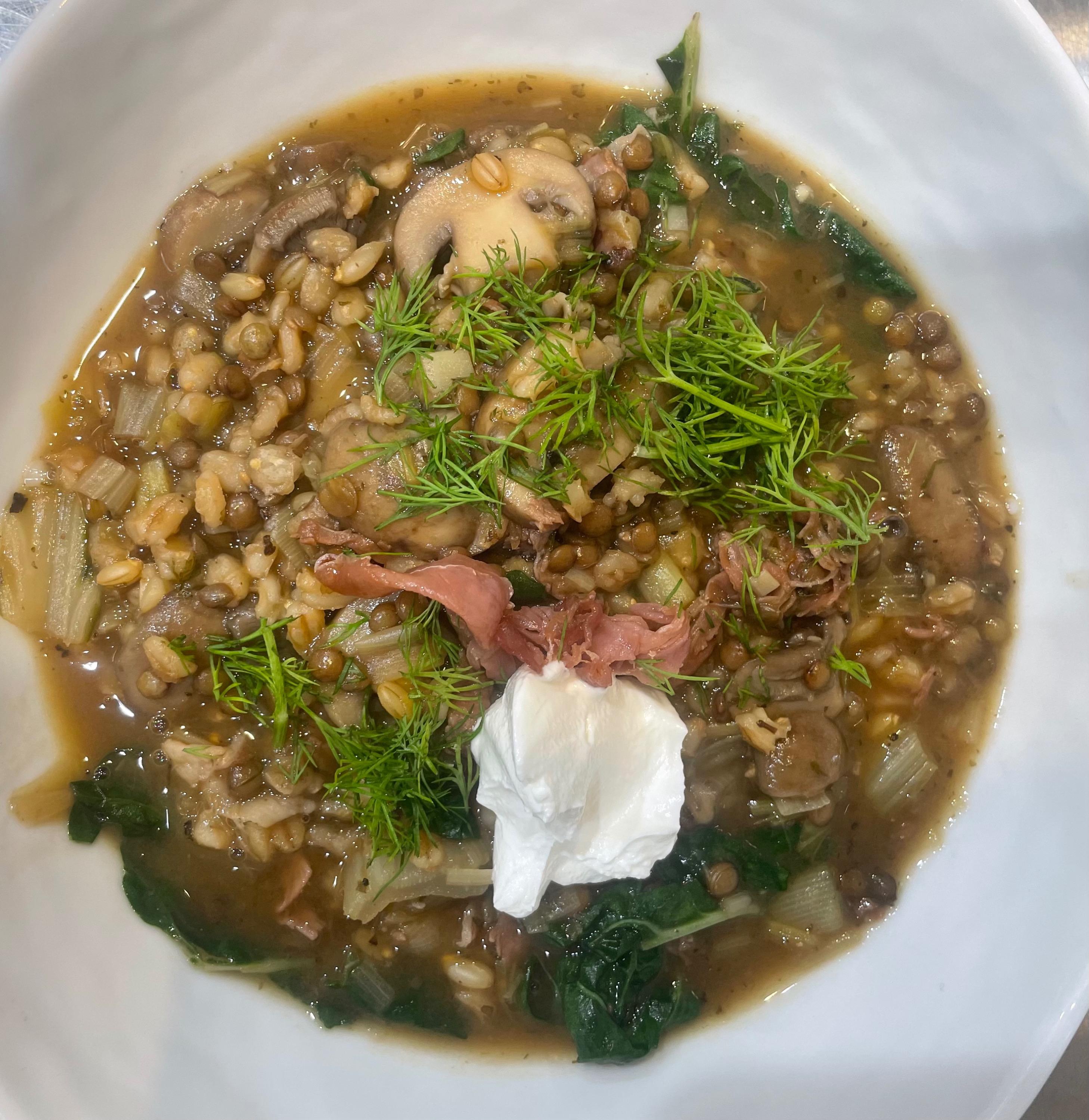 Barley-Lentil Stew with Mushrooms, Crisped Prosciutto, and Dill from “Ancient Grains for Modern Meals” - stew is cooked with hulled barley, pearl barley, puy lentils, prosciutto, leeks, cremini mushrooms, chard stems and leaves, garlic, morita chili, marjoram, oregano, dill, parmesan rind, soy sauce and vegetable broth. Topped with crispy prosciutto, sour cream and dill