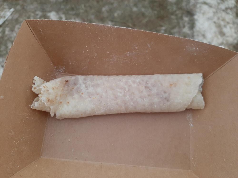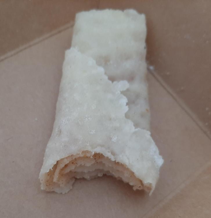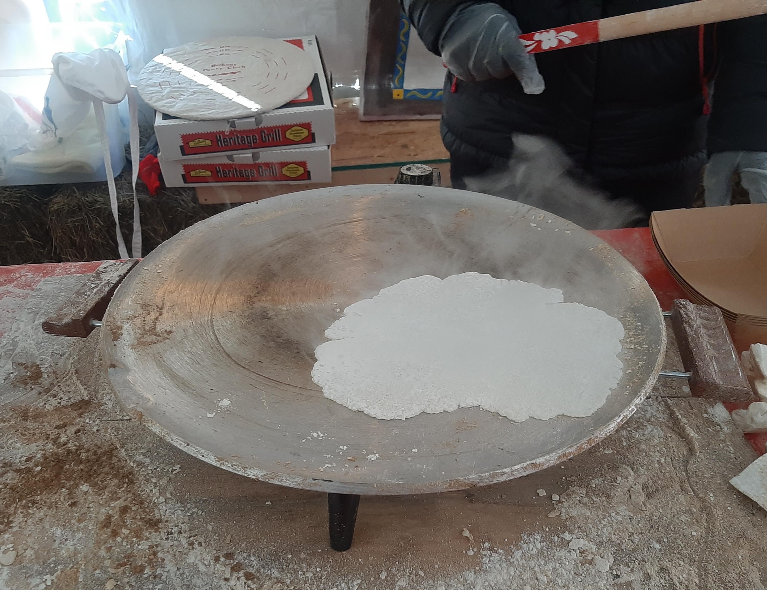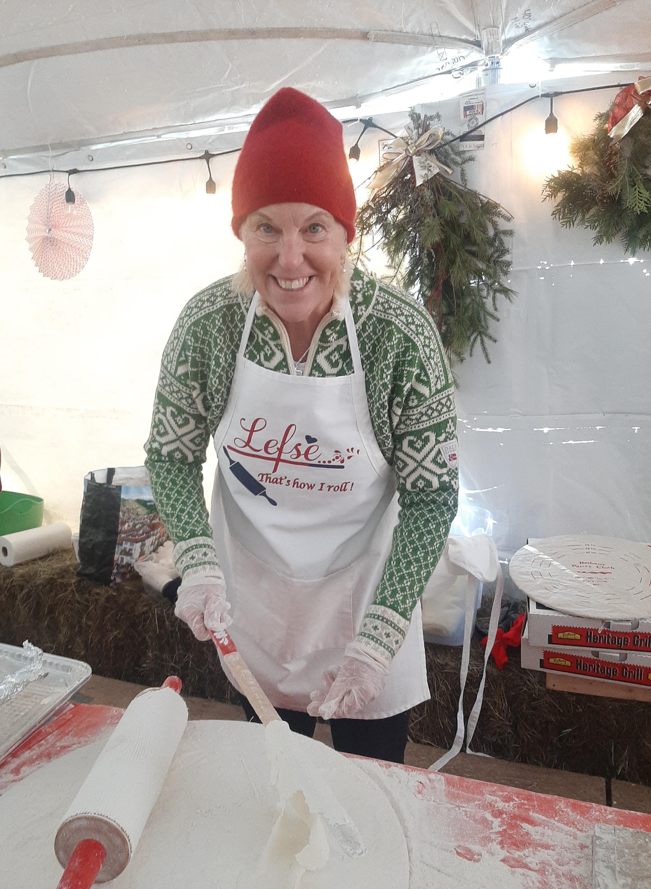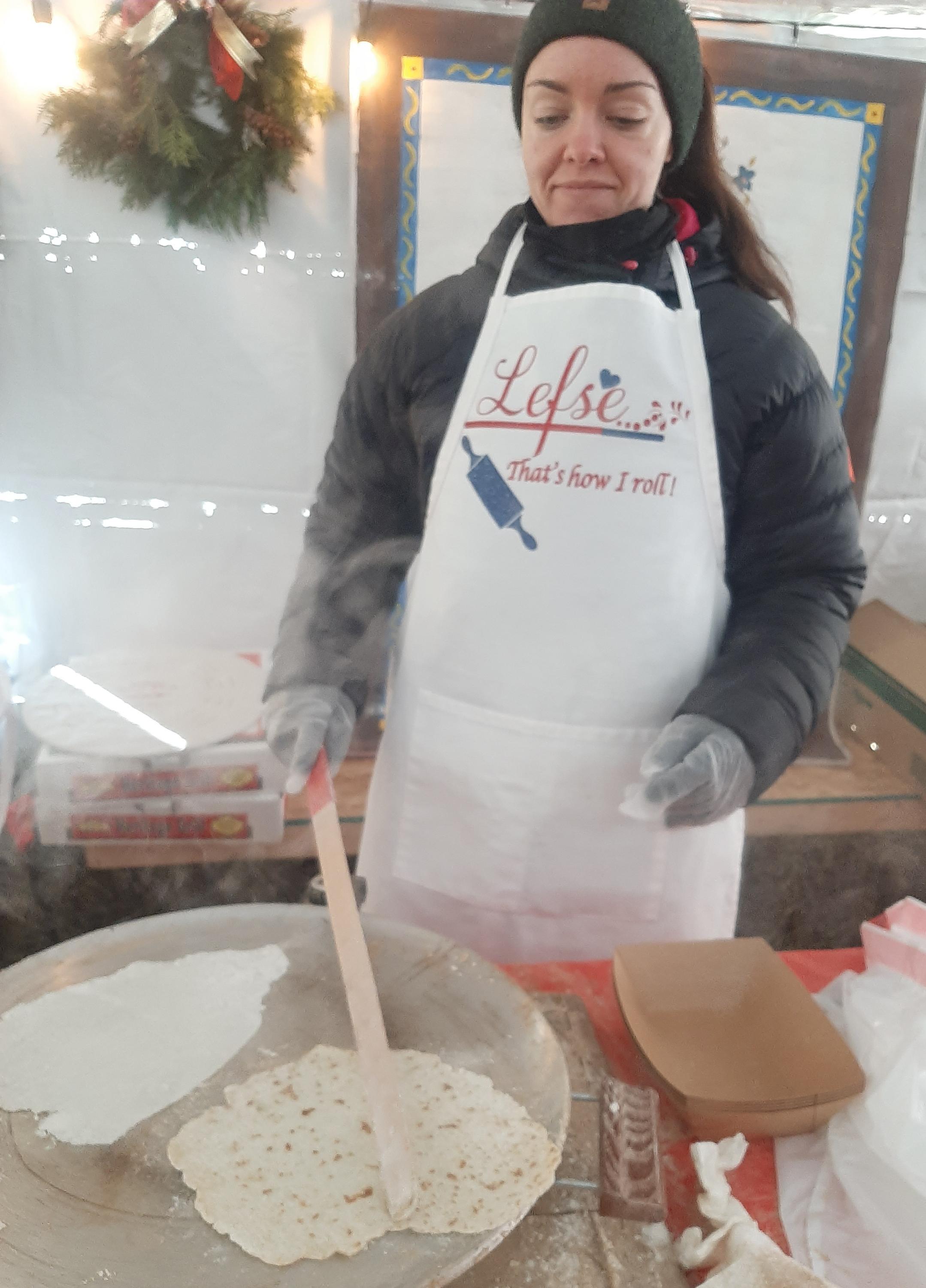 Bumping this up because I'm just back from a nearby Julebyen (Christmas market / festival) where I had lefse for the first time in about 33 years. I don't remember being especially impressed with it back then, but either I was clueless or my neighbor's lefse wasn't all that good! This was a revelation! Demonstration photos taken with permission. I don't have exact proportions of the ingredients (potato, flour, cream) and don't have any photos of the initial dough balls. They looked like they were 2" balls, maybe slightly smaller. Each dough ball was flattened slightly on a very heavily floured disk, I think a cloth-covered board (but forgot to ask), and then rolled until it's very, very thin. Delicately thin. This woman is picking up a disk with the special lefse stick, getting it ready to go onto the griddle. Unfortunately it tore and she had to start over. The rolled disk then went onto a special lefse griddle. (We may be looking at one of those pastry disks in the background of this photo, now that I look carefully.) I asked whether the griddle was required equipment, and was told that the very even heat is important -- but one of the women does her lefse at home on a cast iron griddle. Cook the lefse until it's starting to brown on one side, then flip it to finish cooking. They had an assembly line going, so you can see one flipped and one that hasn't been flipped yet. Use the special lefse stick to lift the finished lefse. In this case, each was being put into a cardboard serving tray, but I think at home it would be a platter. Then, brush it liberally with melted butter... ...sprinkle with sugar and cinnamon... ...roll, and serve. I walked away, took a couple of bites, and stopped stock-still. How delicate! What wonderful flavors! This practically melted in my mouth. I went back with my compliments: "This is like tasting the most delicious, beautiful cloud I can imagine!" You should have seen them beam.