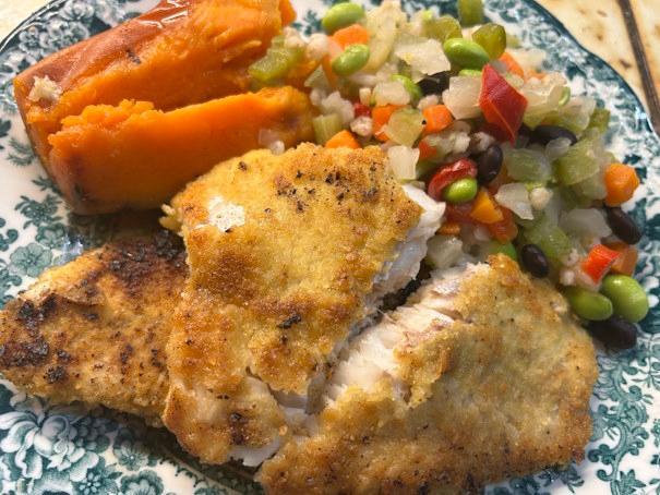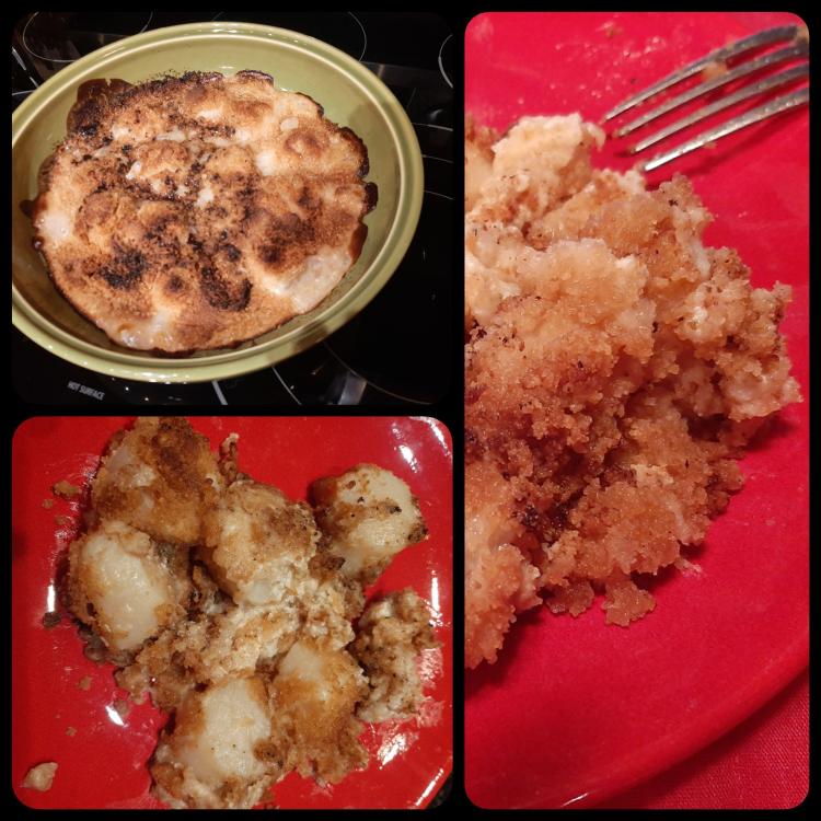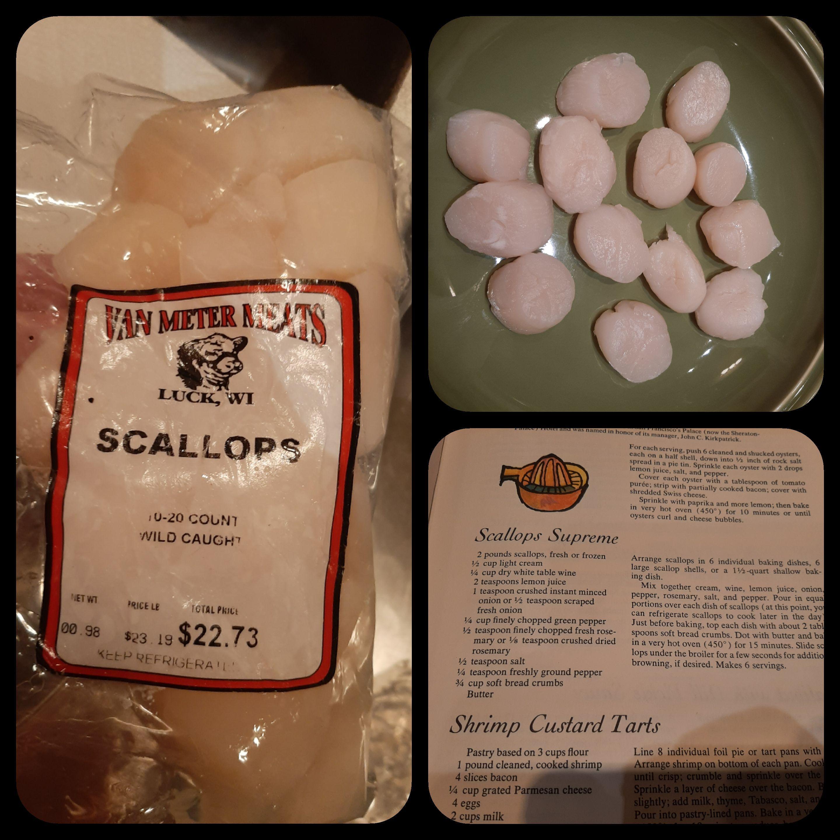Scallops Supreme, recipe from the Sunset Cookbook: Food with a Gourmet Touch (eG-friendly Amazon.com link). I love scallops, when they're properly cooked. It's hit-or-miss whether I cook them properly. I've had a couple of hits, and a couple of misses. Tonight I decided to try a new recipe, with these scallops I bought last June. I thawed them and dried them carefully while deciding what to do with them, then hit on this recipe from the Sunset cookbook. Oops! After committing myself to this recipe I realized that it called for 2 pounds of scallops, and I only had 1 pound's worth. I soldiered on. The basic recipe is to mix cream, white wine, lemon juice and seasonings, and pour them over the scallops before adding bread crumbs and butter. I thought I'd use only half the liquid and use the rest later. As I poured, I decided it wasn't important. I was probably using too big a baking pan. After the scallops are mostly cooked, you can broil if desired. I turned up the heat, but my oven is out of sorts right now. Changing racks was enough. Excellent flavor. My darling used to complain that he thought scallops were too dry. He wouldn't have thought so with this recipe.
