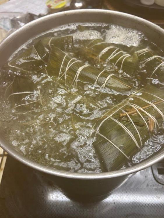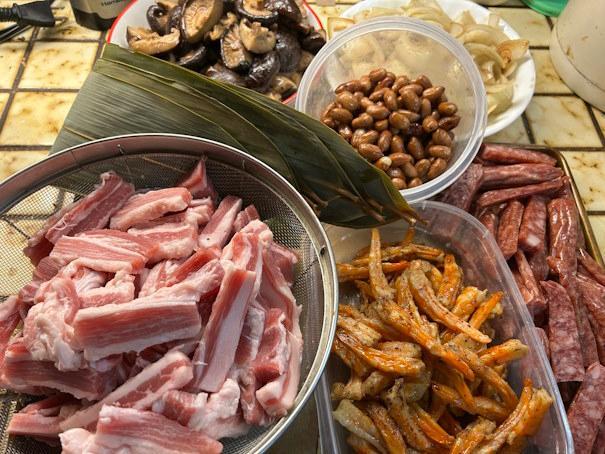 My old boilng joong set up. an old turkey deep fryer burner outside died, so I had to boil the joong on my stove: 16 packets at a time! It was easier topping up the pot with hot water tho' instead of running outside. Added lots of humidity and and a couple of facials. 😊 I prepped the leaves 3 days before, and the rest of the ingredients day before. Couldn't find uncooked salted egg yolks this time, so had to use cooked ones. Now, what to do with all the cooked egg whites?