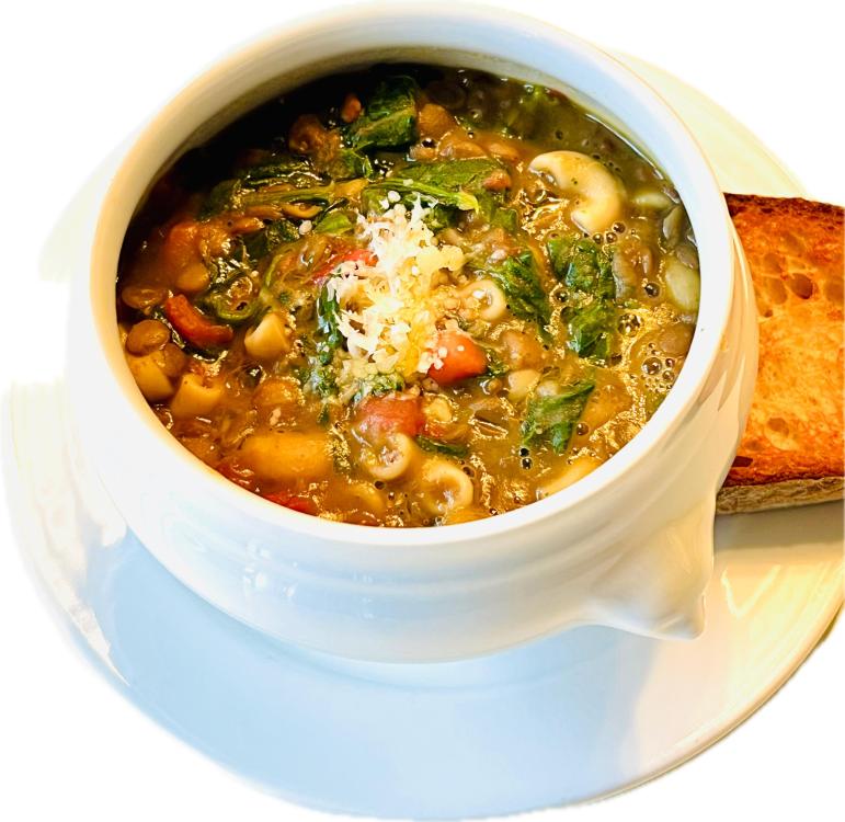 Lentil soup with carrots, tomatoes, spinach, onions, garlic, topped with freshly grated Parmesan. Mini caramelized apple tart.