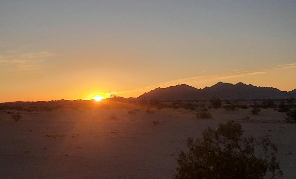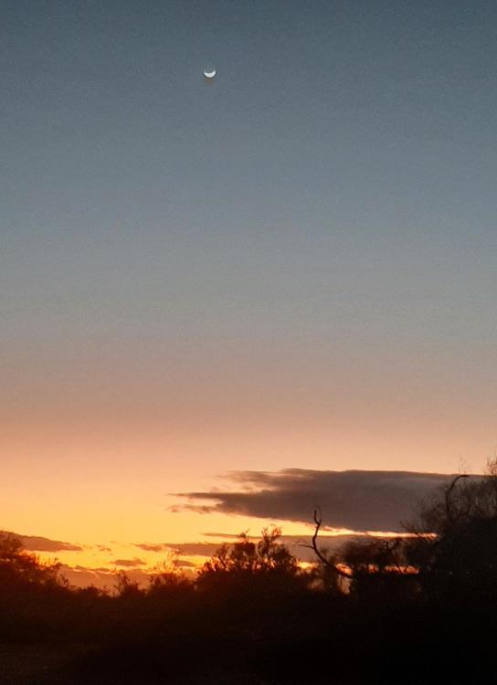 2. It's been blowing like crazy the past couple of days, and through the night. Fortunately for me the wind has veered enough that the trees lining the nearby wash act as a windbreak, as they normally do; when I first arrived the wind was coming right up the tree line and rocking the trailer. Right now it's calm. Maybe I'll be able to have a campfire tonight. This trailer came with a solar panel to keep the batteries charged, and an inverter prep so that I could get an inverter installed if I wished. Last summer I paid to get that inverter, in the hopes that some of my electrical outlets would work without having to start the portable generator(s) in the back of the pickup. I also had extra batteries installed for storage purposes. Well. It turns out that the inverter runs almost everything -- even the microwave! -- and I'm delighted. However, even with the extra batteries I'm having to relearn how to deal with the long cool nights. Yesterday morning I was rousted at 05:00 by flashing lights that told me the furnace couldn't start due to low power. Yesterday afternoon I set up a generator and ran it to charge the batteries after the sun had gone down, and turned the furnace way down before I went to bed. I made it to 06:00 before the flashing lights started! I'm not sure yet what I'll cook for the day's meals. It'll be fun to plan. Yesterday, late afternoon, I had a linner of more of that mac 'n' cheese 'n' ham, supplemented with more cheese, chopped roasted vegetables, and chopped green chile. Blah. It was still bland. Needed salt! That helped, but I do think this is my most disappointing batch ever of the stuff. As I noted before, it's been quite a while since I made it. Maybe I've lost my touch. Maybe I've lost my appetite for the dish. I was treated to a beautiful sunset last night, and a beautiful sunrise this morning.