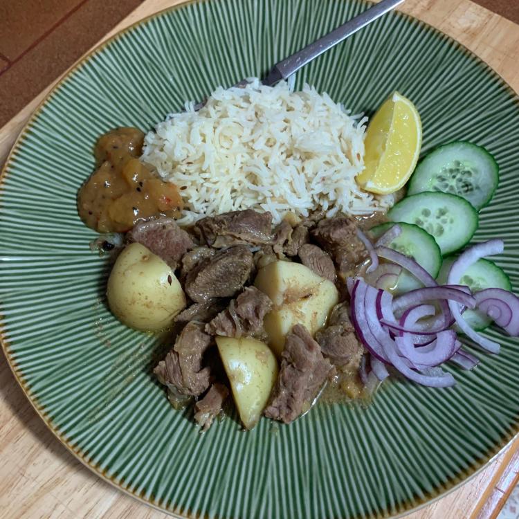 I’m lucky to have a friend who hobby farms a small herd of goats. This is a Meera Sodha recipe for a simple goat and potato curry. Served with cumin rice, a bit of salad and my homemade mango chutney. Please excuse the poor lighting.