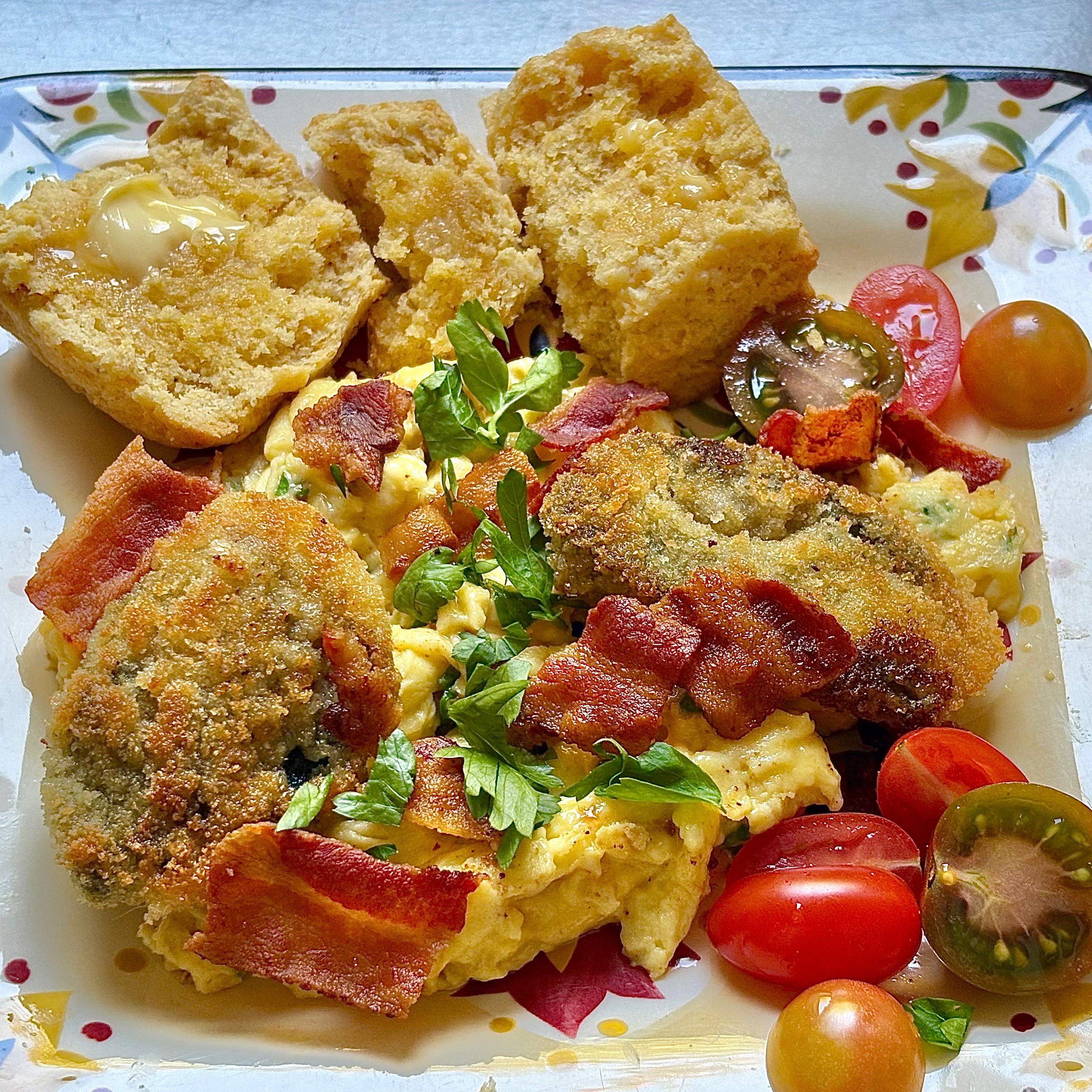 If Brussels sprouts for breakfast are challenging, how about shucking oysters for today’s Hangtown Fry? Oysters, breaded and fried in bacon fat on scrambled eggs with crispy bacon. I consulted a bunch of recipes but went with the one in the Hog Island Book of Fish and Seafood except that I took the oysters out of the pan before pouring in the eggs so they’d stay crispy. These oysters were on the large size for this purpose but I wanted to try it and worked with what I got in my weekly fish share.
