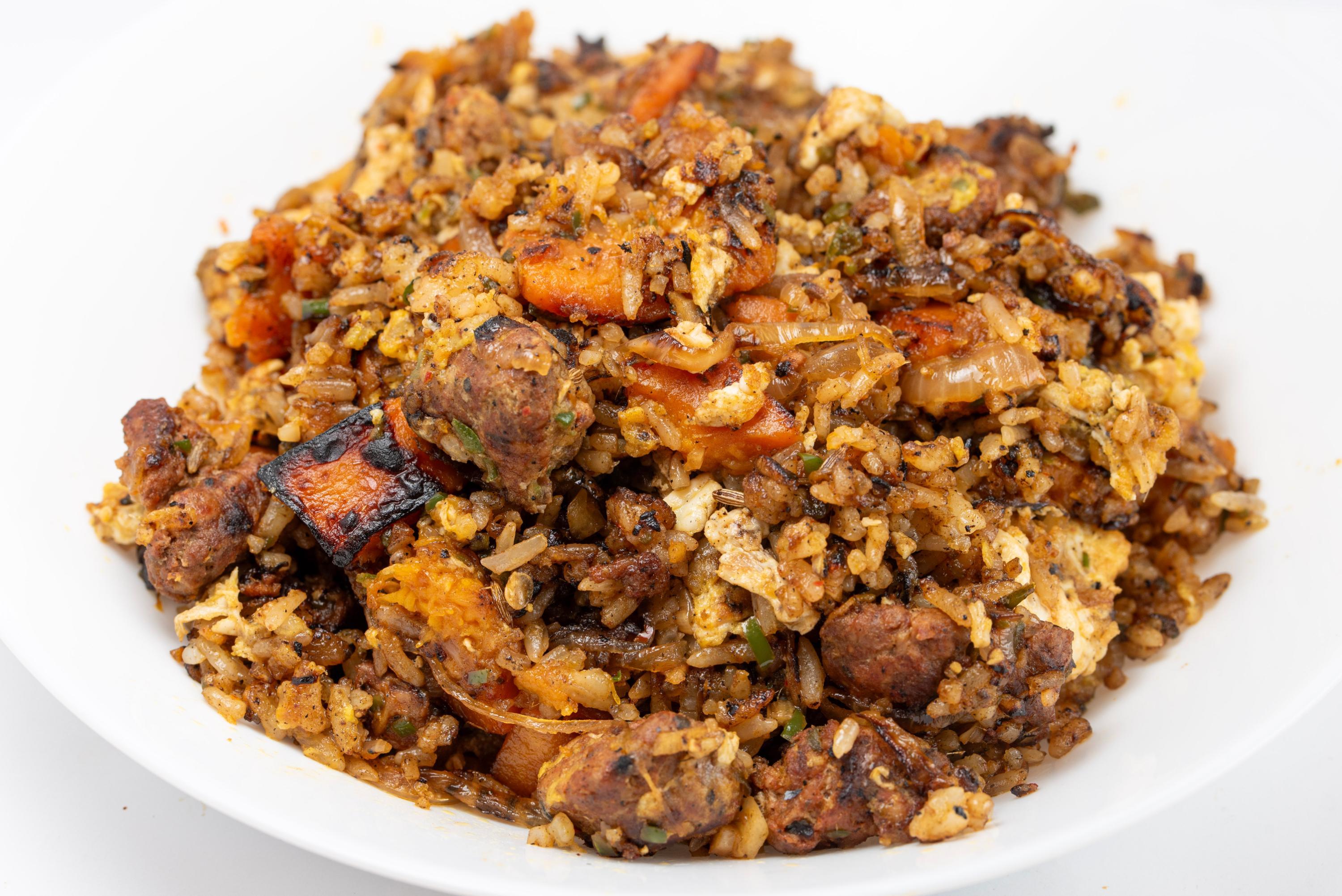 Chorizo and butternut squash fried rice with onion, garlic, ginger, jalapeno, red curry paste, cumin seed, fish sauce, and an egg.