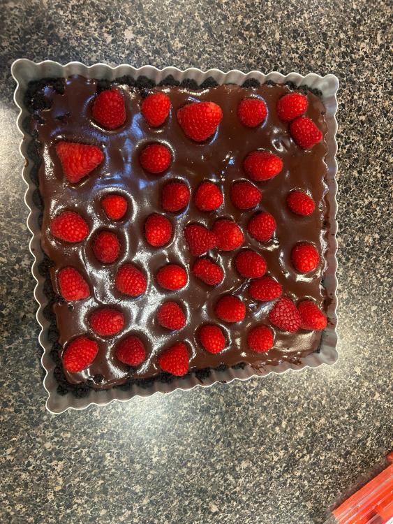 Here is my dessert for our "Not Quite Valeentine's Day" dinner tonight. Chocolate ganache tart. The top is normally covered with raspberries but I got the vapours when I saw that they were 5.99 Cdn for 6 ounces, so just strew some over the top and will glam it up with some raspeberry coulis ans whipped cream and no one will every know!